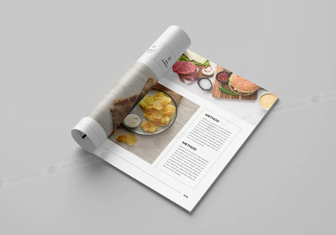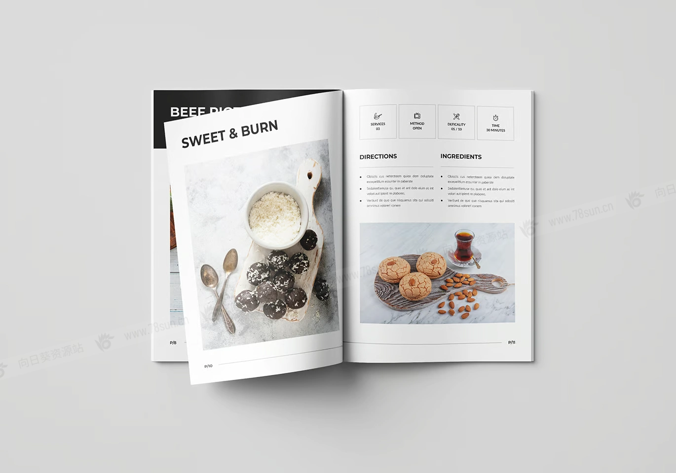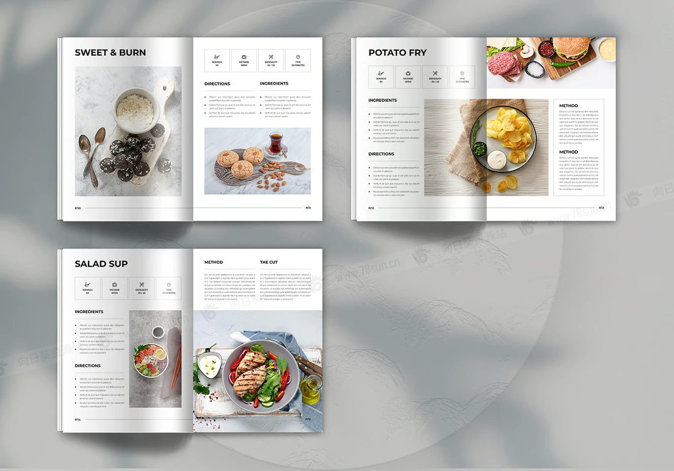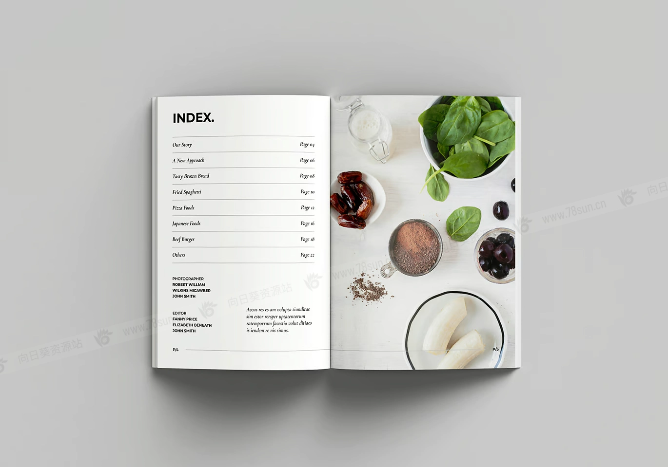美食餐厅烹饪指南食谱小册子杂志宣传册画册indd设计模板。这种布局适用于任何项目目的,非常易于使用和定制。定制它并用您自己的颜色替换徽标和品牌颜色很容易,(它有 A4 和美国信纸两种尺寸)