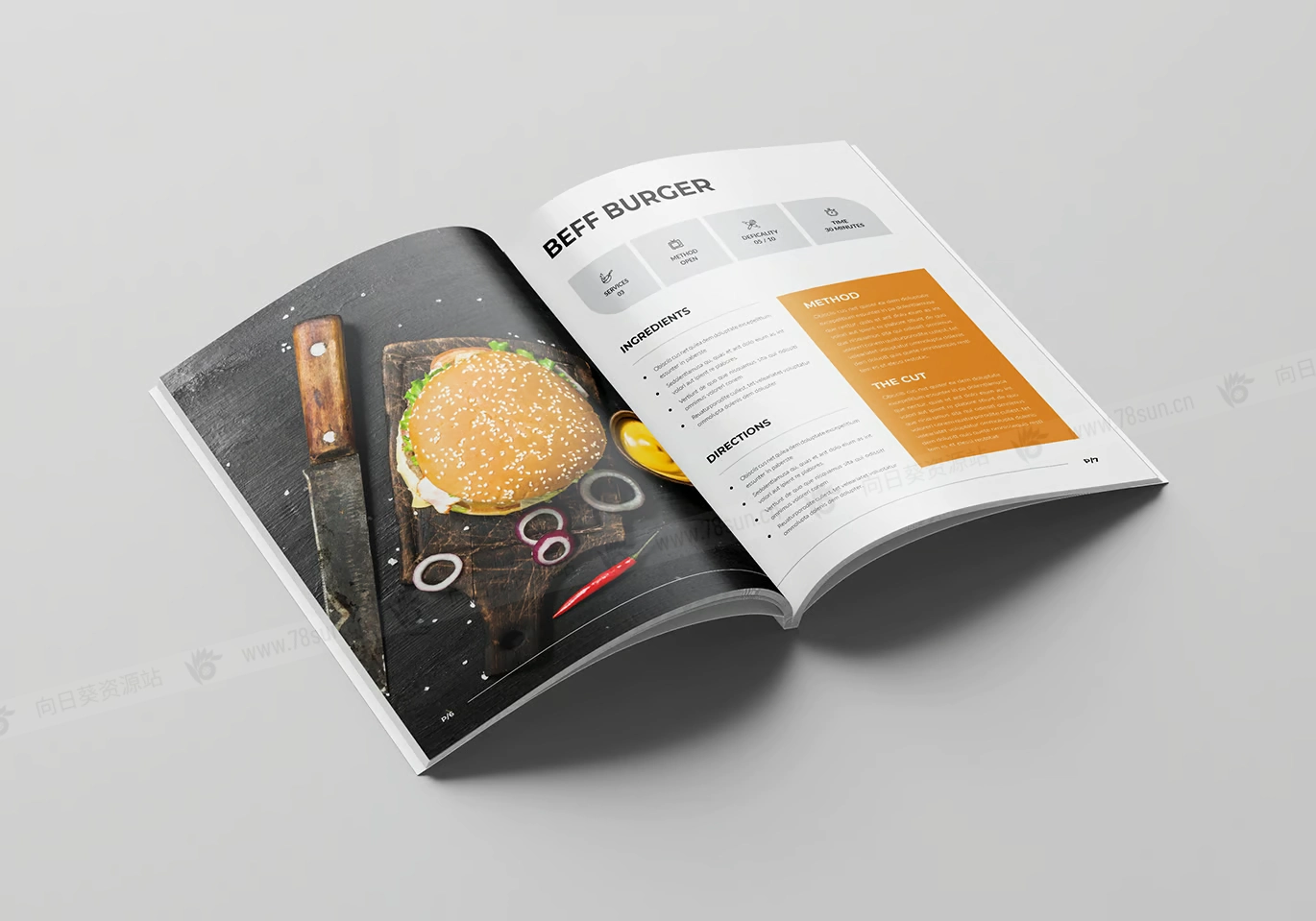 美食餐厅烹饪指南食谱小册子杂志宣传册画册indd设计模板。这种布局适合任何项目目的,非常易于使用和定制。很容易自定义它并用您自己的颜色替换徽标和品牌颜色,(它有 A4 和美国信纸两种尺寸可供选择)
