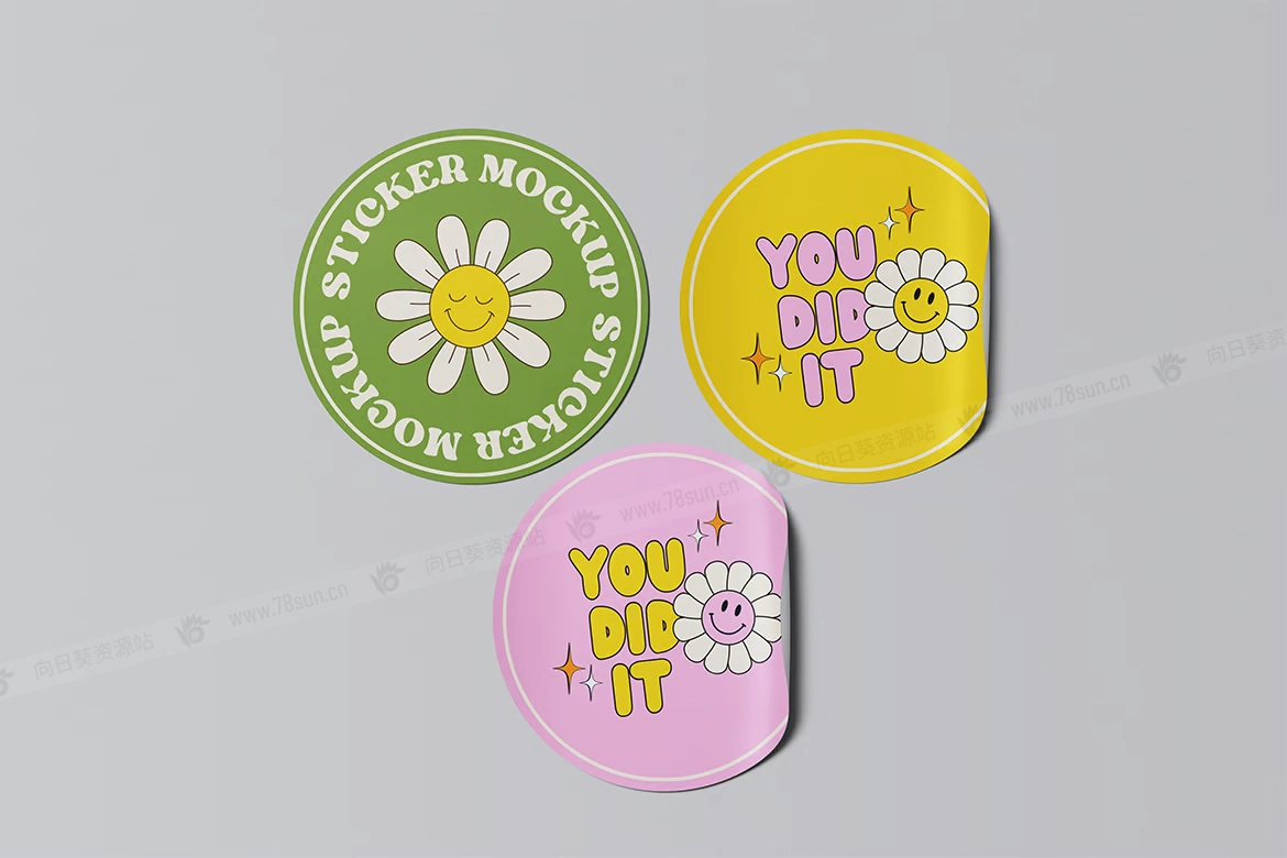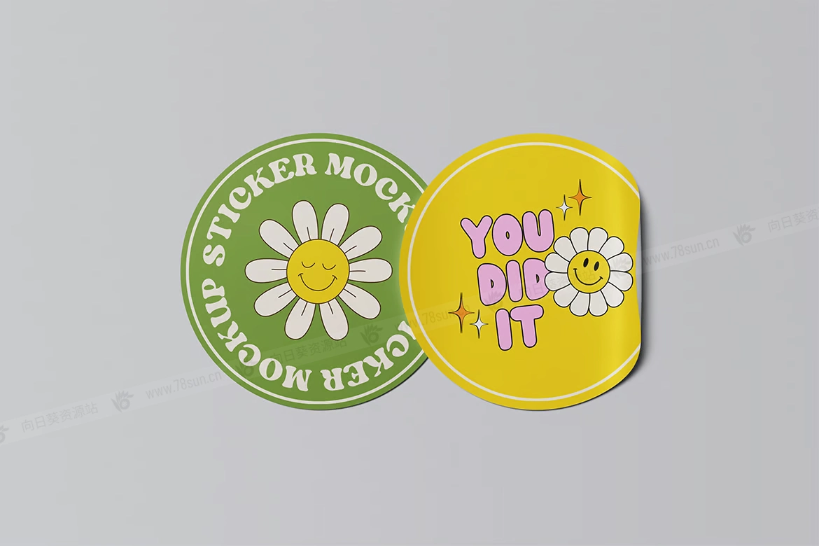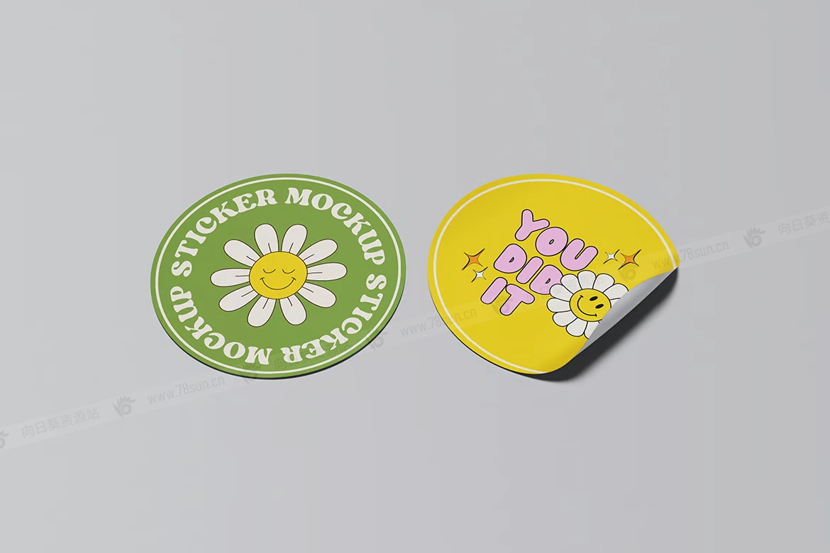 圆形剥皮贴纸VI效果图展示智能贴图psd设计样机,使用智能对象功能,可帮助您在几秒钟内更改设计,即使对于 Photoshop 的初学者也易于使用。