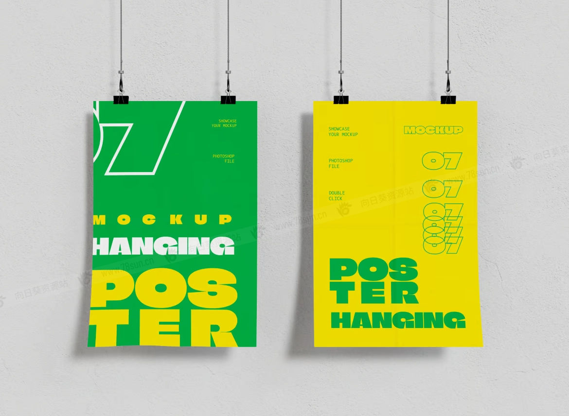 悬挂式海报广告宣传单VI效果图展示智能贴图psd设计样机,用于品牌推广、演示或营销活动,用于展示海报设计、广告或活动传单,