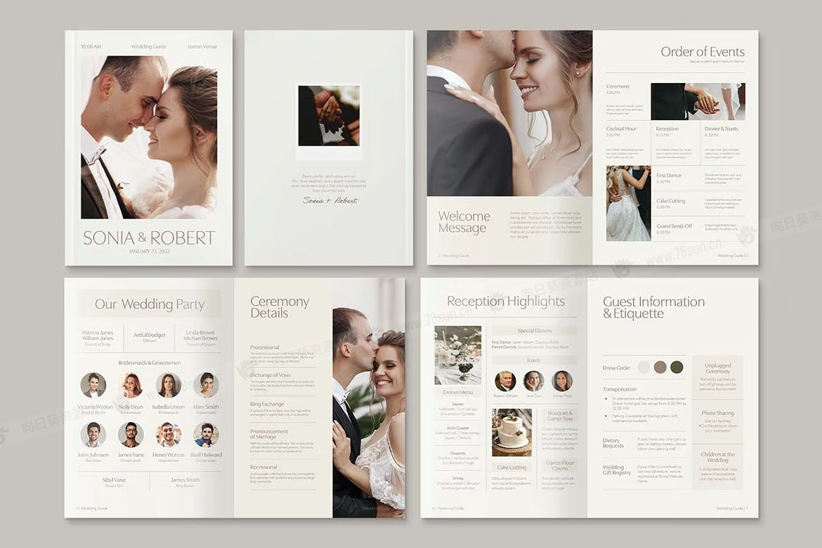 时尚生活婚礼婚庆公司小册子杂志宣传册画册indd设计模板。它提供 Canva 和 InDesign 格式(IDML、INDD),非常适合组织仪式细节、宾客信息和活动顺序。专为新娘、新郎和婚礼策划师设计,可作为综合手册或传单,