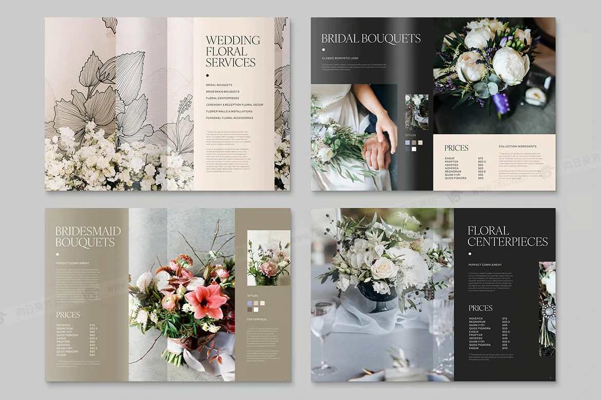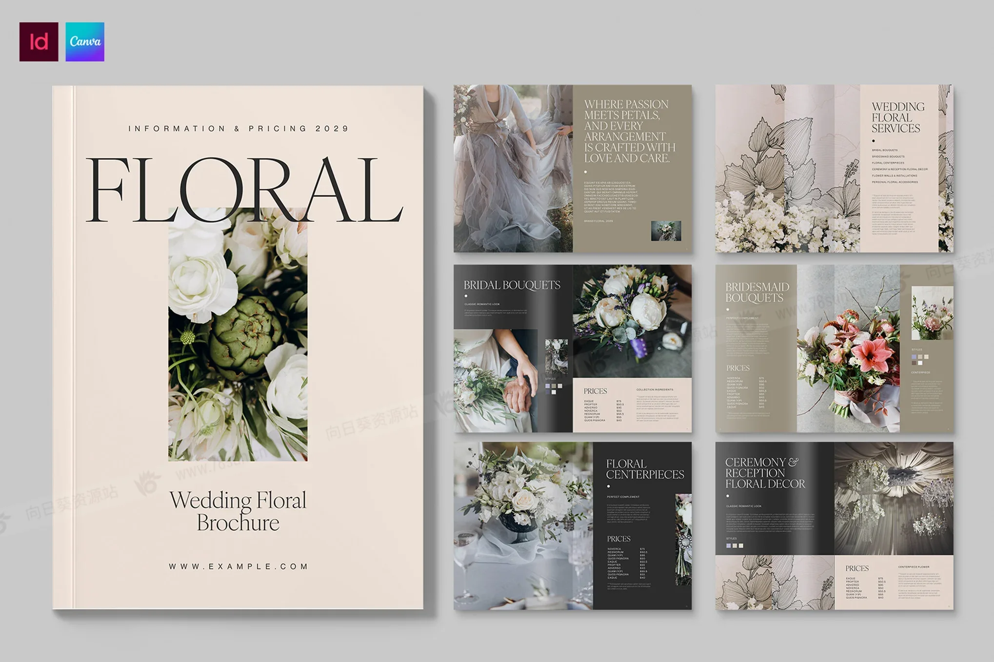 时尚生活婚礼婚庆公司花店小册子杂志宣传册画册indd设计模板。它提供 Canva 和 InDesign IDML 和 INDD 格式,非常适合商业作品集、演示文稿和杂志风格的相册。