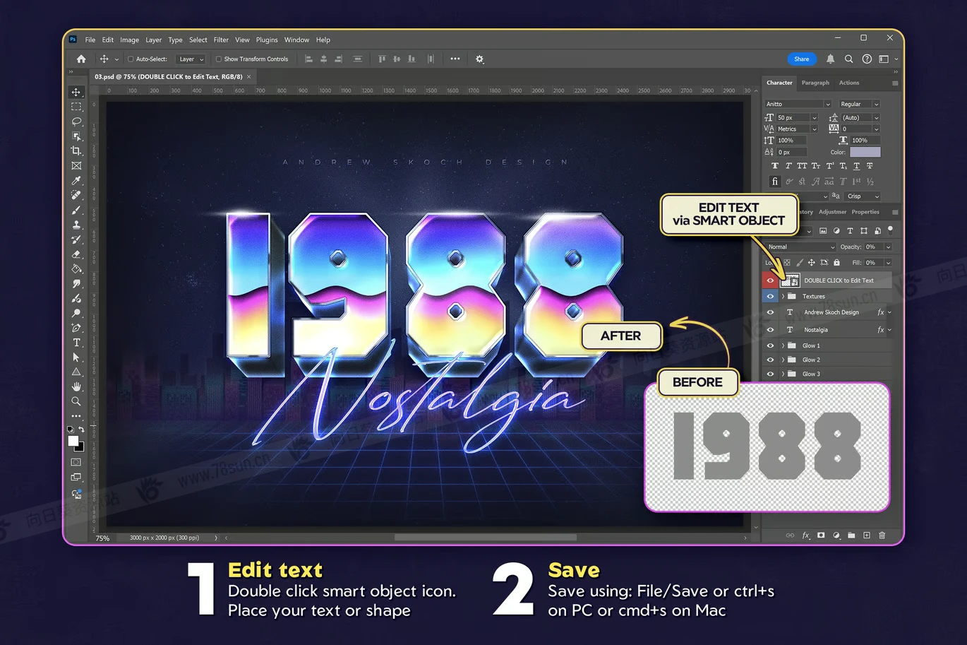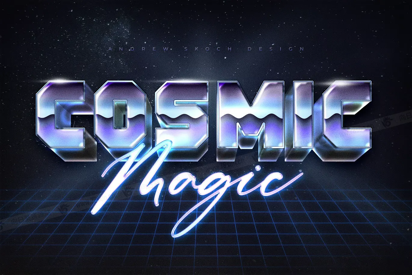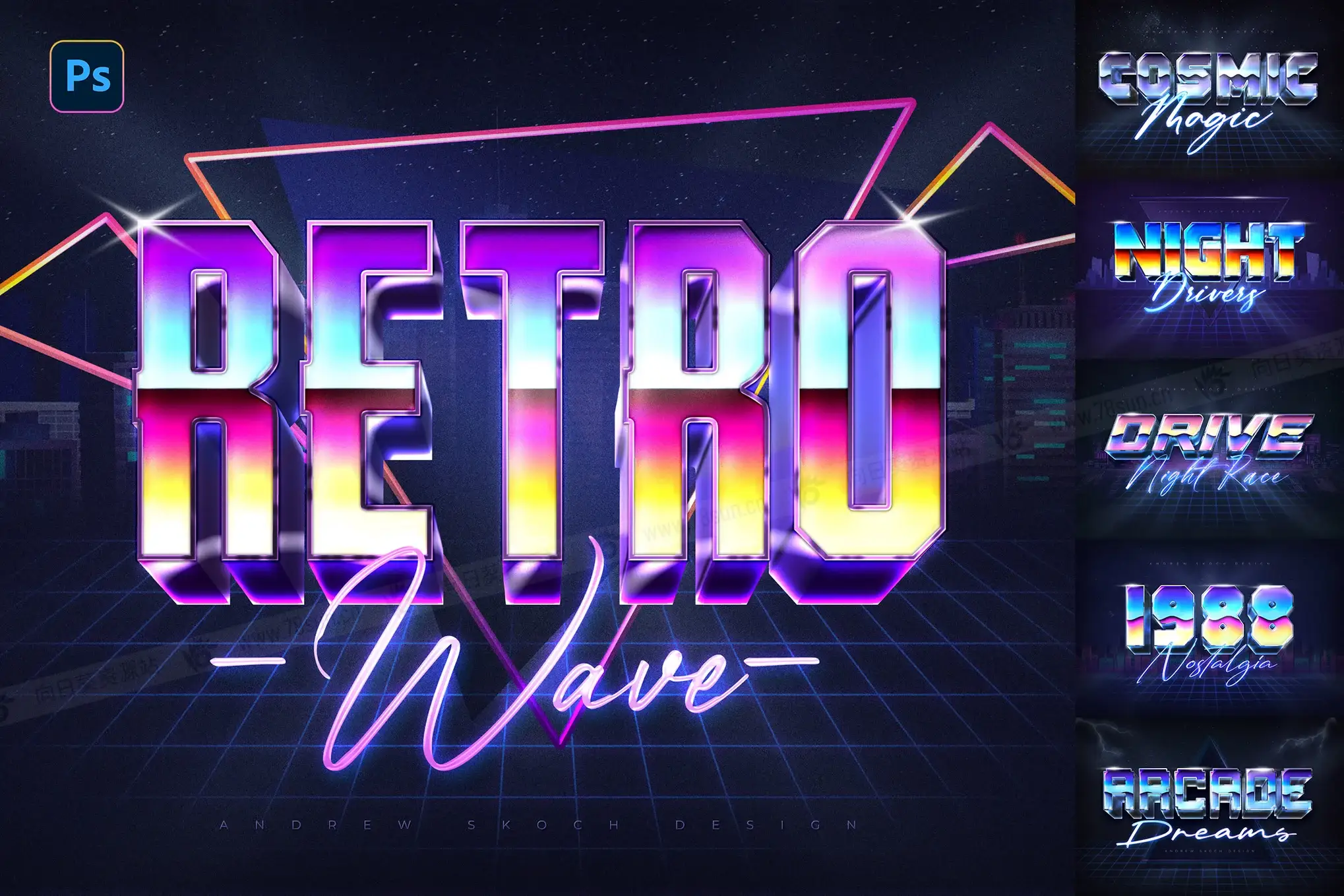 只需单击几下,即可在 Photoshop 中轻松应用这些效果,并将任何文本转换为动态、高能量的 80 年代杰作。无