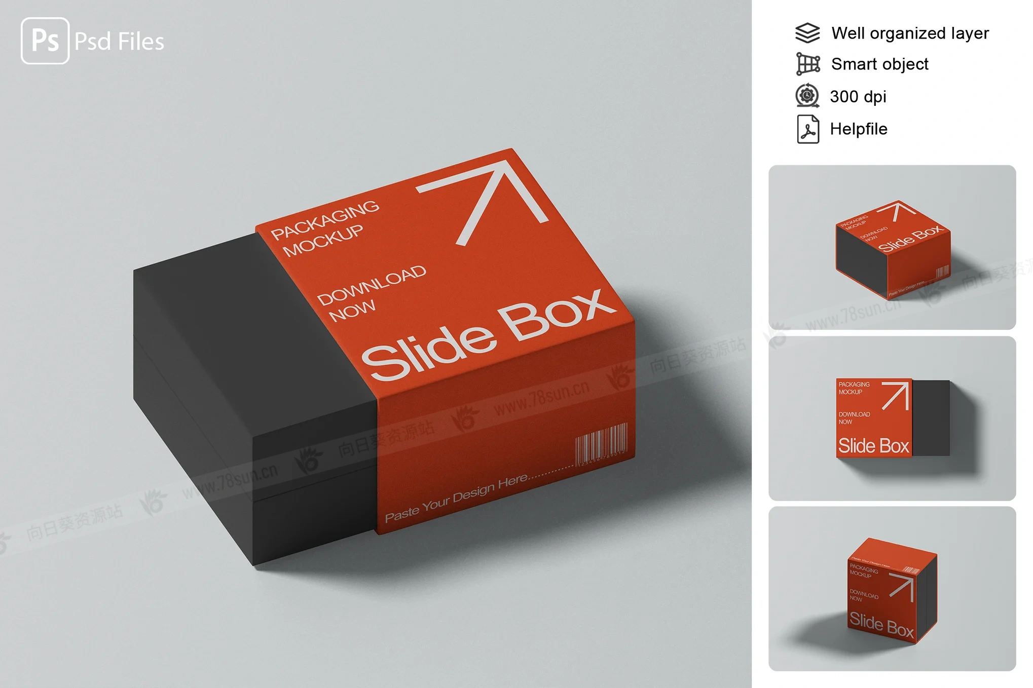 方形滑动礼品盒VI效果图展示智能贴图psd设计样机,此模型包括 04 个具有分层良好 PSD 文件,并且此模型还使用智能对象功能,这意味着您可以在几秒钟内轻松快速地使用自己的设计更改当前设计。