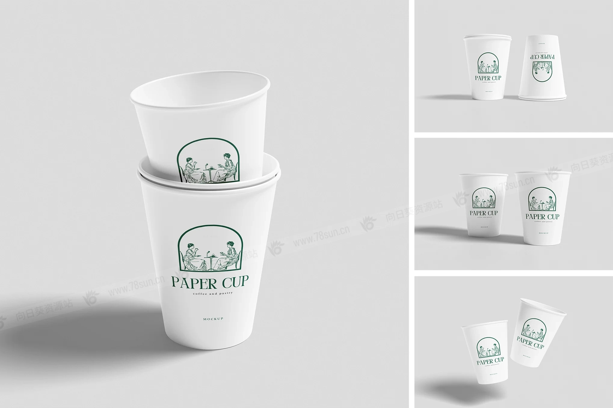 咖啡杯纸杯品牌VI效果图展示智能贴图psd设计样机,此模型包括 04 个具有分层良好的 PSD 文件,并且此模型还使用智能对象功能,这意味着您可以在几秒钟内轻松快速地使用自己的设计更改当前设计。
