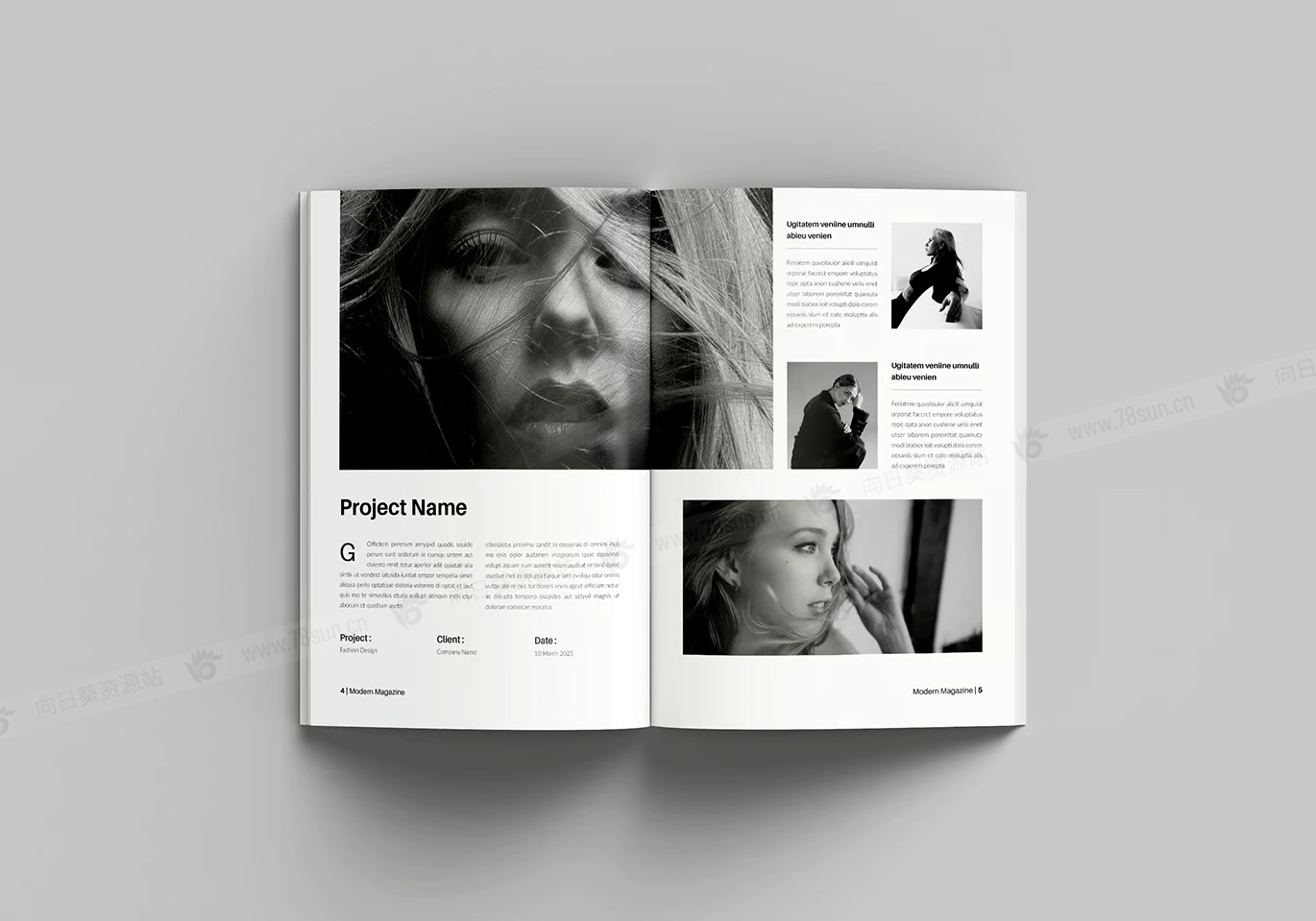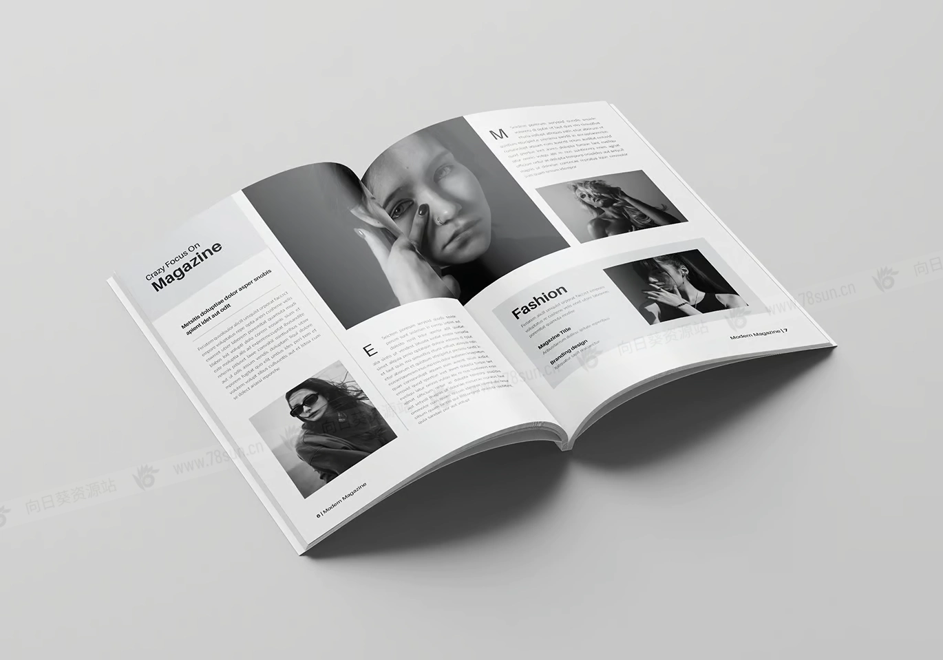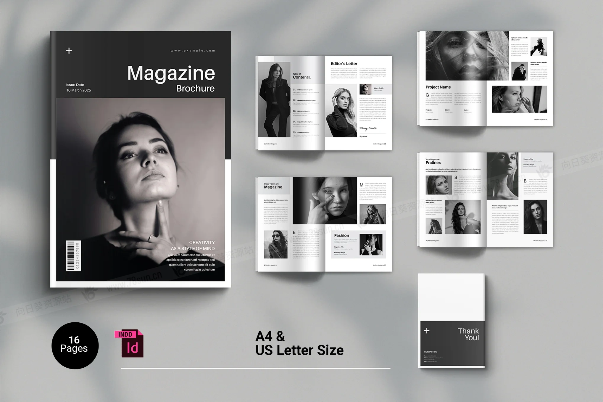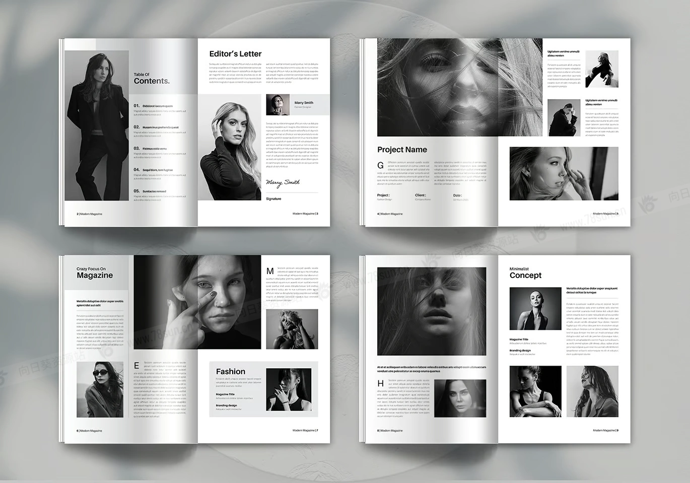 时尚摄影作品集小册子杂志宣传册画册indd设计模板。这种布局适合任何项目目的,非常易于使用和定制。很容易自定义它并用您自己的颜色替换徽标和品牌颜色,(它有 A4 和美国信纸两种尺寸可供选择)