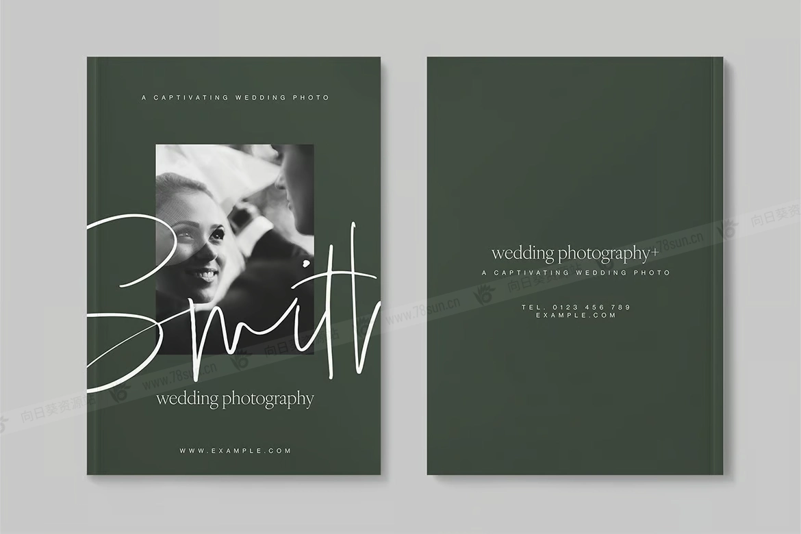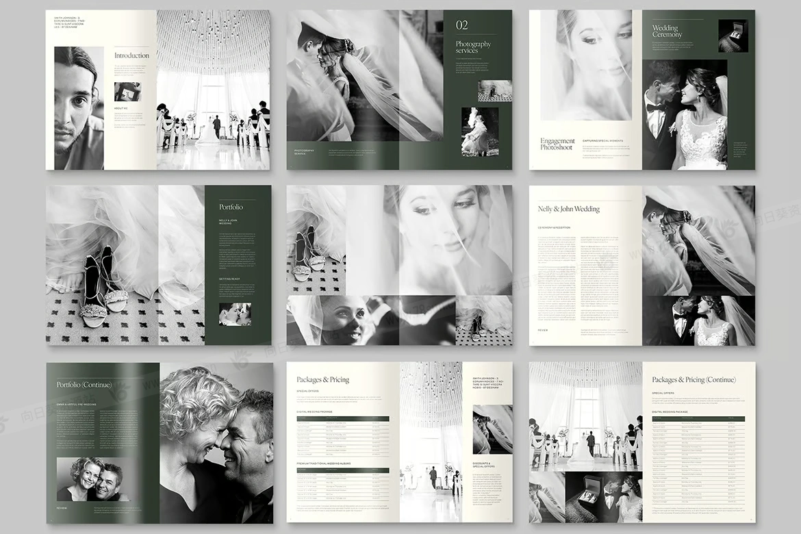 婚礼摄影作品集小册子杂志宣传册画册indd设计模板,非常适合向婚礼场地、情侣和策划师展示您的摄影作品集。凭借 Canva、InDesign IDML 和 INDD 格式的双折版面