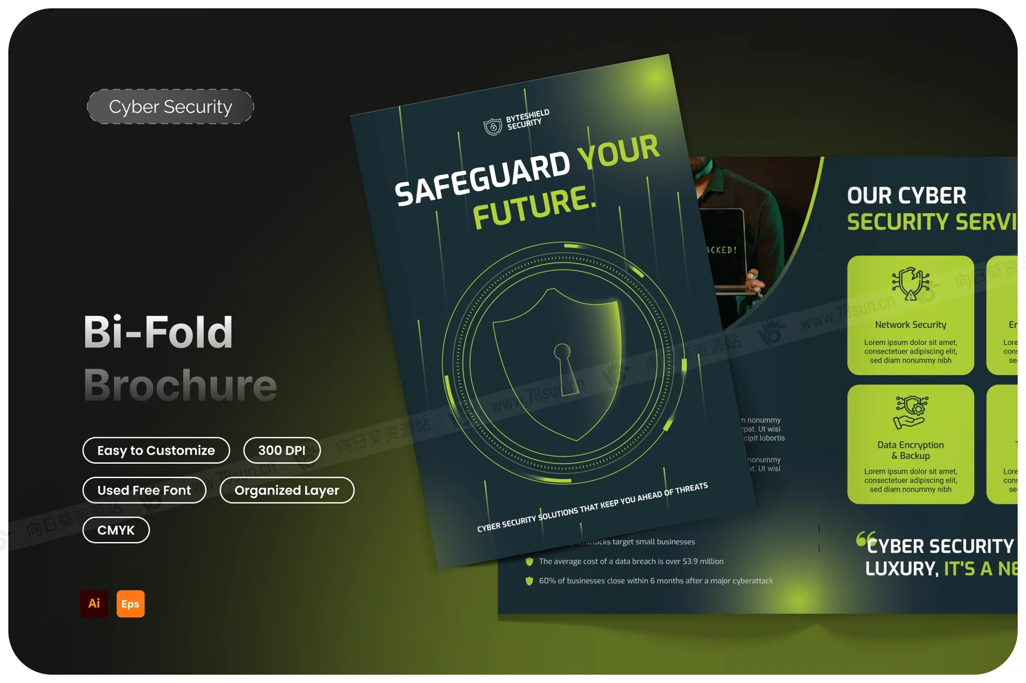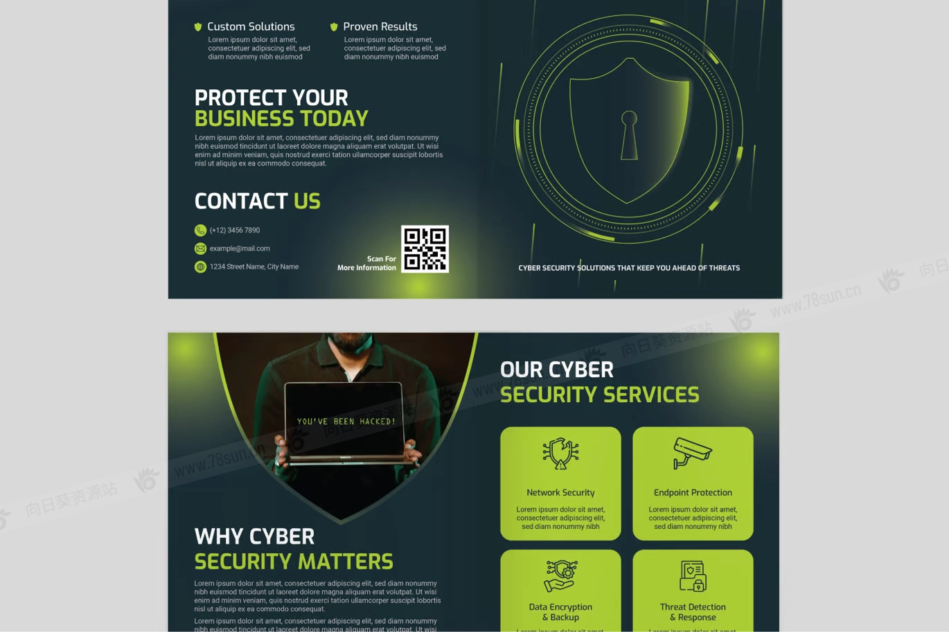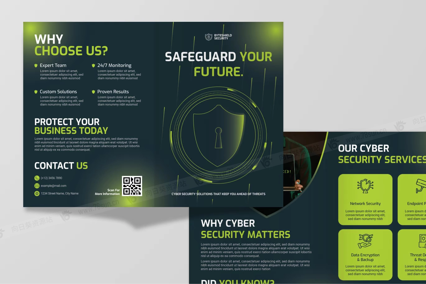 科技IT网络安全双折页宣传单小册子ai设计模板,适用于各种用途,例如:网络安全意识、风险管理、数据保护服务、IT 咨询、企业安全策略、技术解决方案、数字防御、网络安全、合规培训、信息安全协议、威胁情报、网络防御意识、安全审计、企业安全解决方案、云安全、在线欺诈预防、网络钓鱼保护、数据加密、身份盗窃预防。