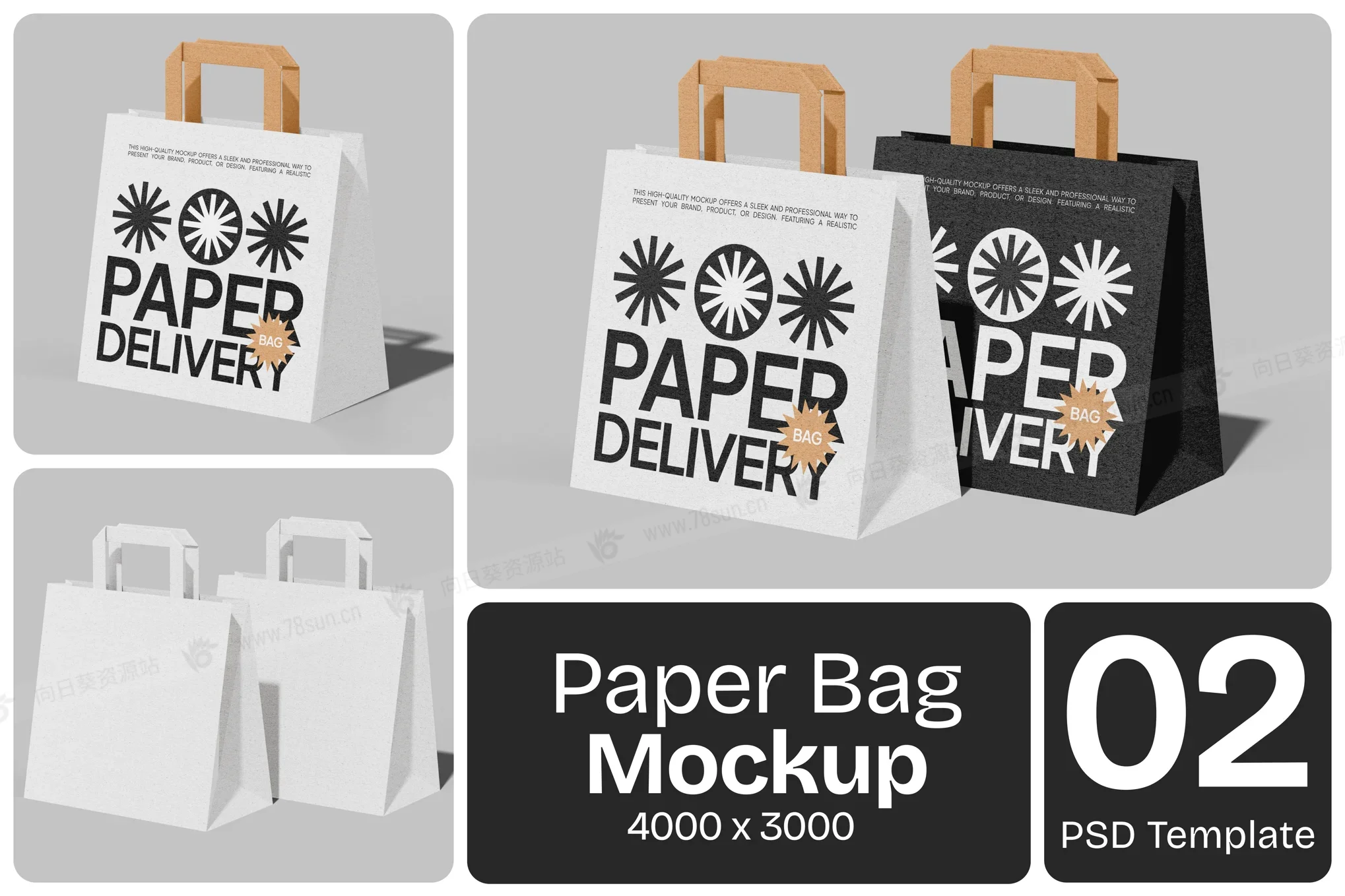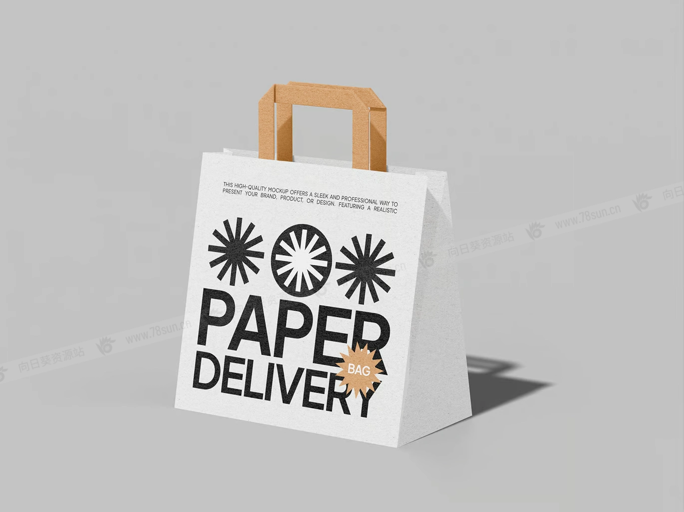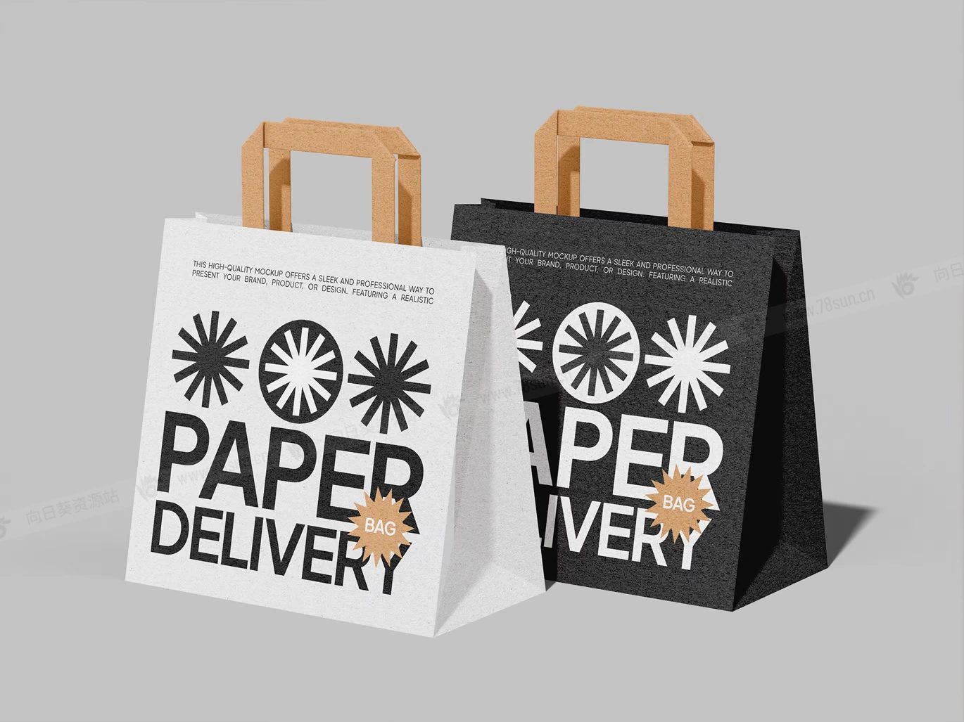 纸质手提袋购物袋VI效果图展示智能贴图psd设计样机,非常适合展示餐厅品牌、外卖包装或环保送货解决方案。