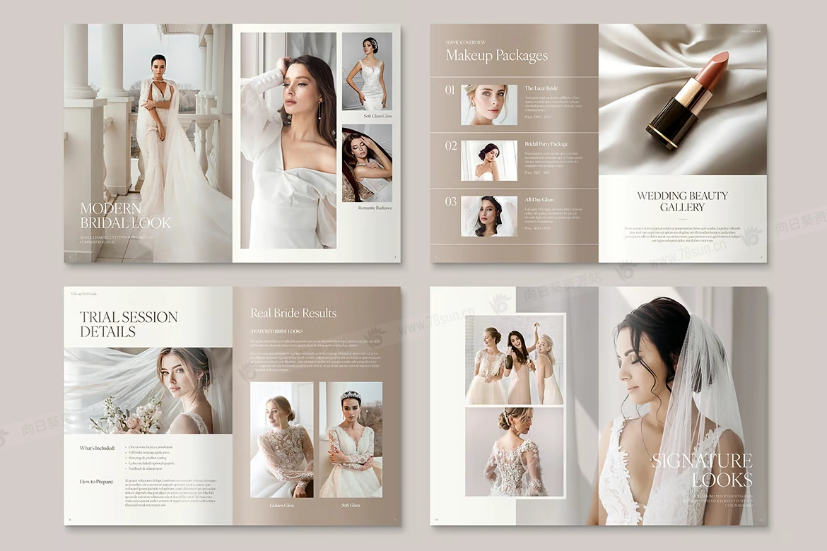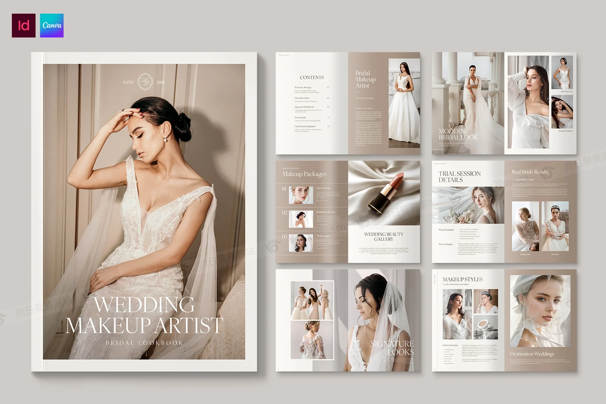 婚礼婚庆公司目录摄影作品集小册子杂志宣传册画册indd设计模板。这款多功能模板提供 Canva、Adobe InDesign IDML 和 INDD 格式,可为各种项目(从活动到作品集演示)提供可自定义的布局。