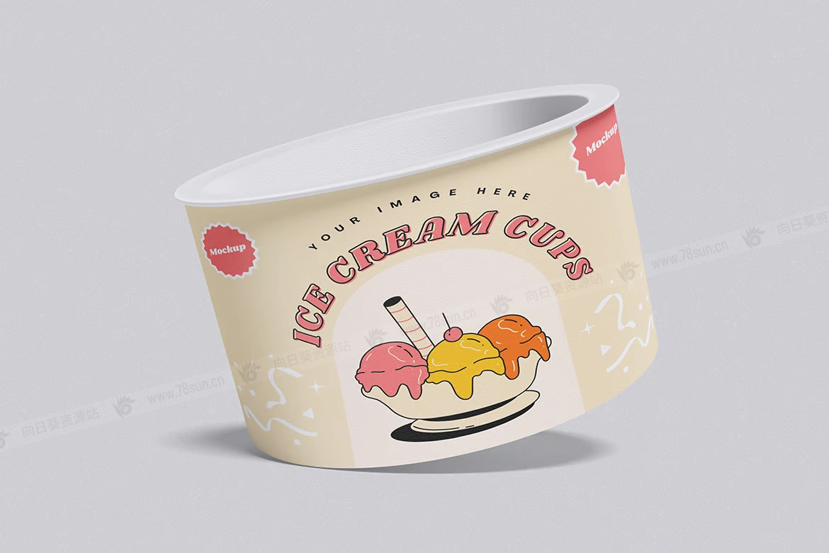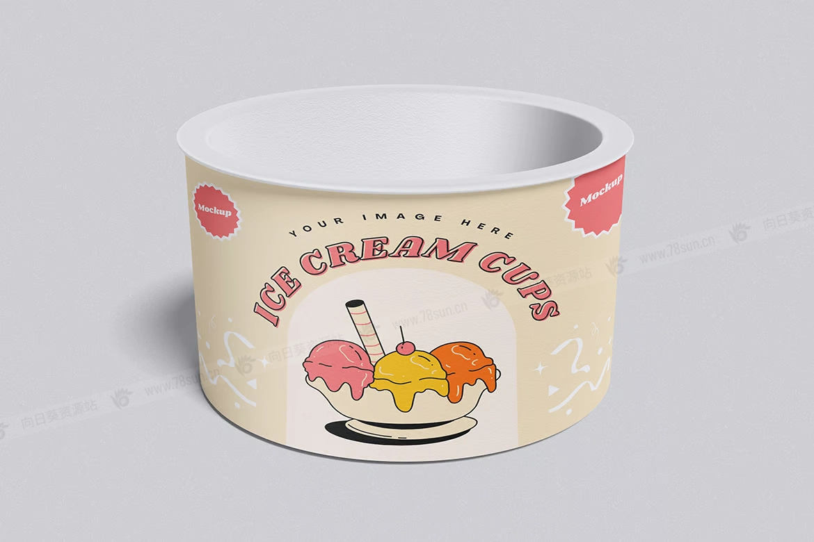 冰淇淋纸杯品牌VI效果图展示智能贴图psd设计样机,此模型包括 04 个具有分层良好 PSD 文件,并且此模型还使用智能对象功能,这意味着您可以在几秒钟内轻松快速地使用自己的设计更改当前设计。