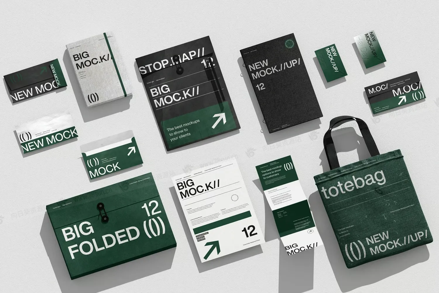 名片笔记本信封文件夹折页文具品牌VI效果图展示智能贴图psd设计样机,包括信封、文件夹、纸张、名片、笔记本和手提袋,非常适合展示品牌标识设计和专业营销材料,风格简洁现代。