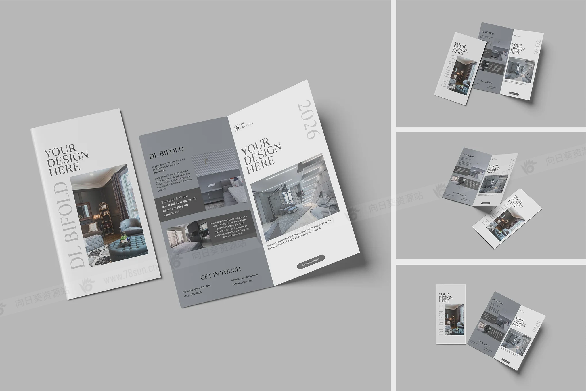 DL双折页产品宣传小册子VI效果图展示智能贴图psd设计样机。提供 PSD Photoshop 格式,具有智能对象功能,可帮助您在几秒钟内用自己的设计替换当前设计。