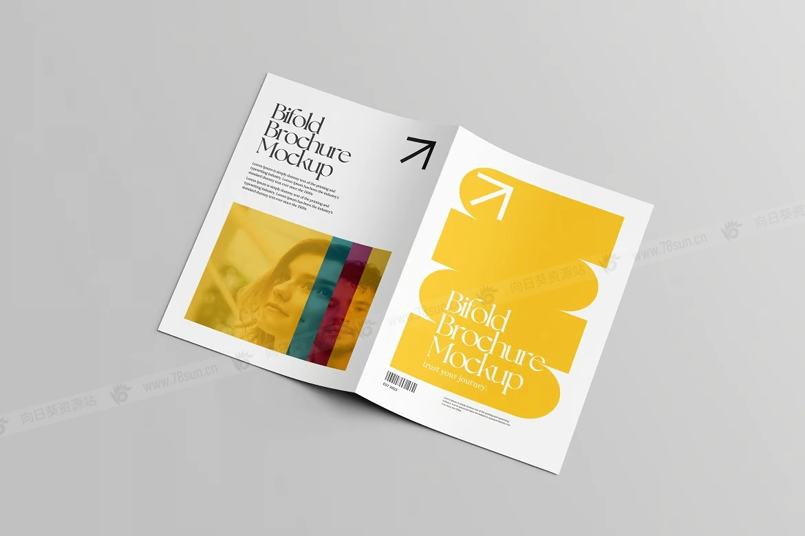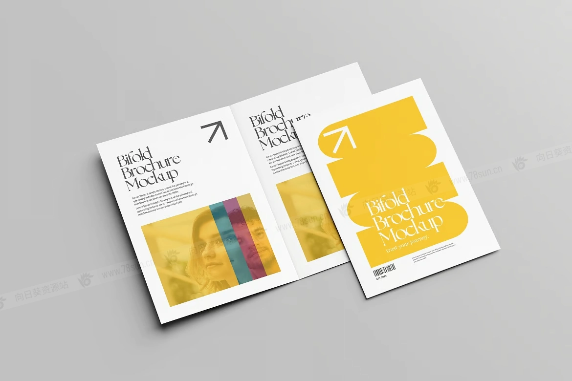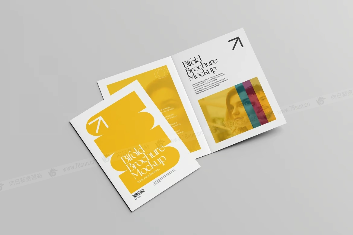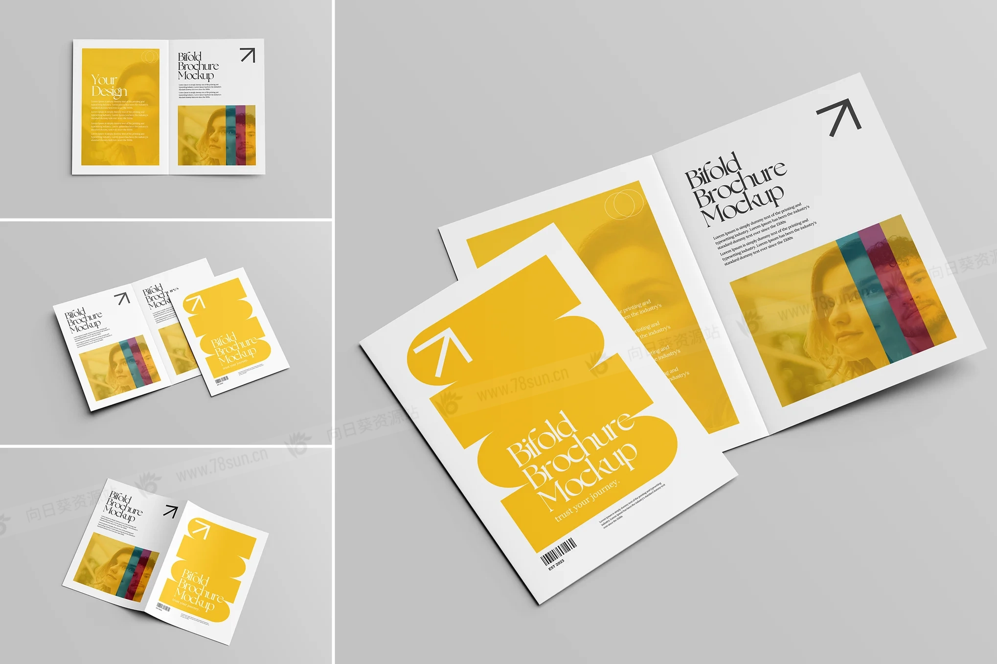 A4双折页宣传册小册子VI效果图展示智能贴图psd设计样机。这个模型包括 04 个,具有分层良好的 PSD 文件,并且这个模型还使用了智能对象功能,这意味着您可以在几秒钟内轻松快速地使用您的设计更改当前设计。