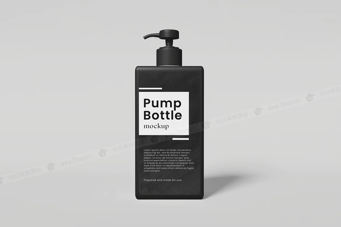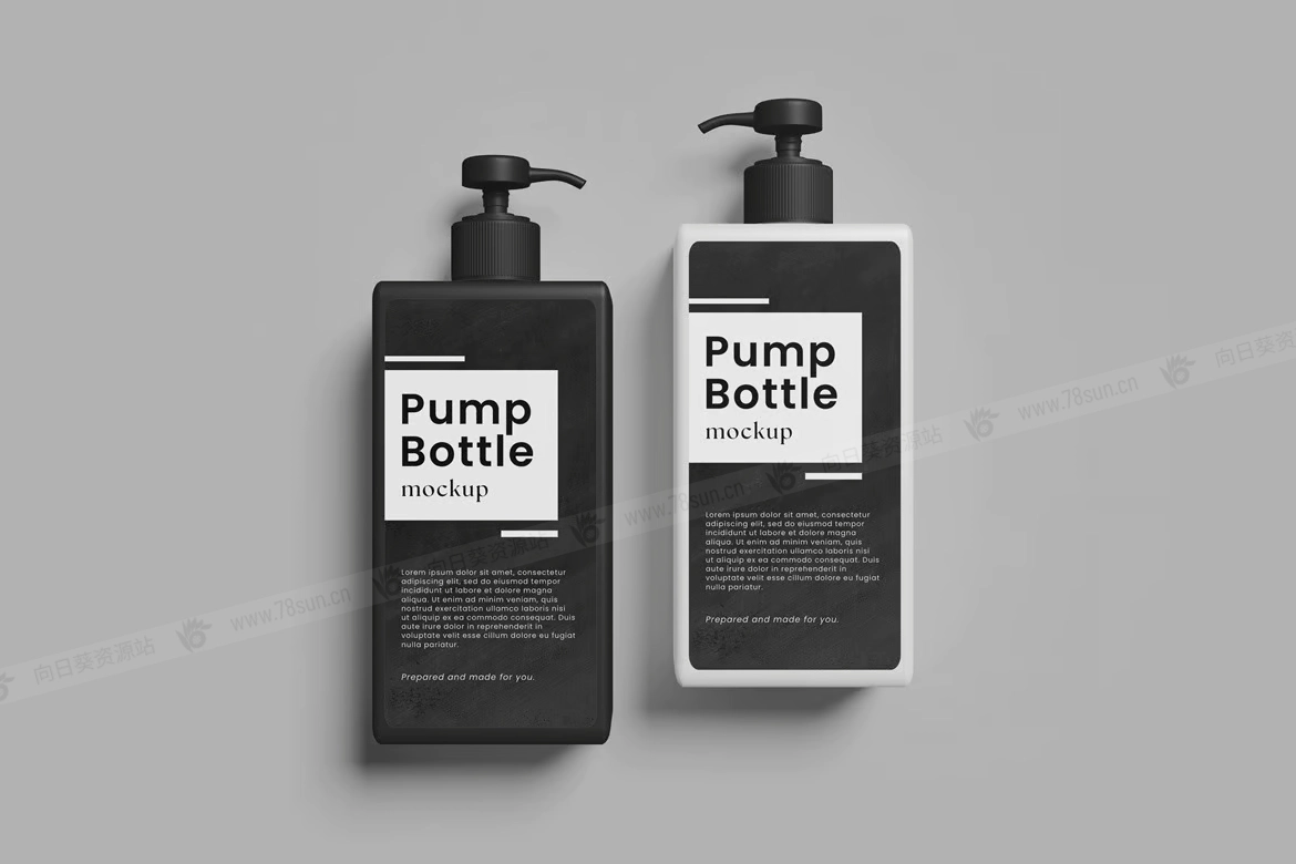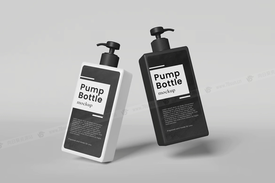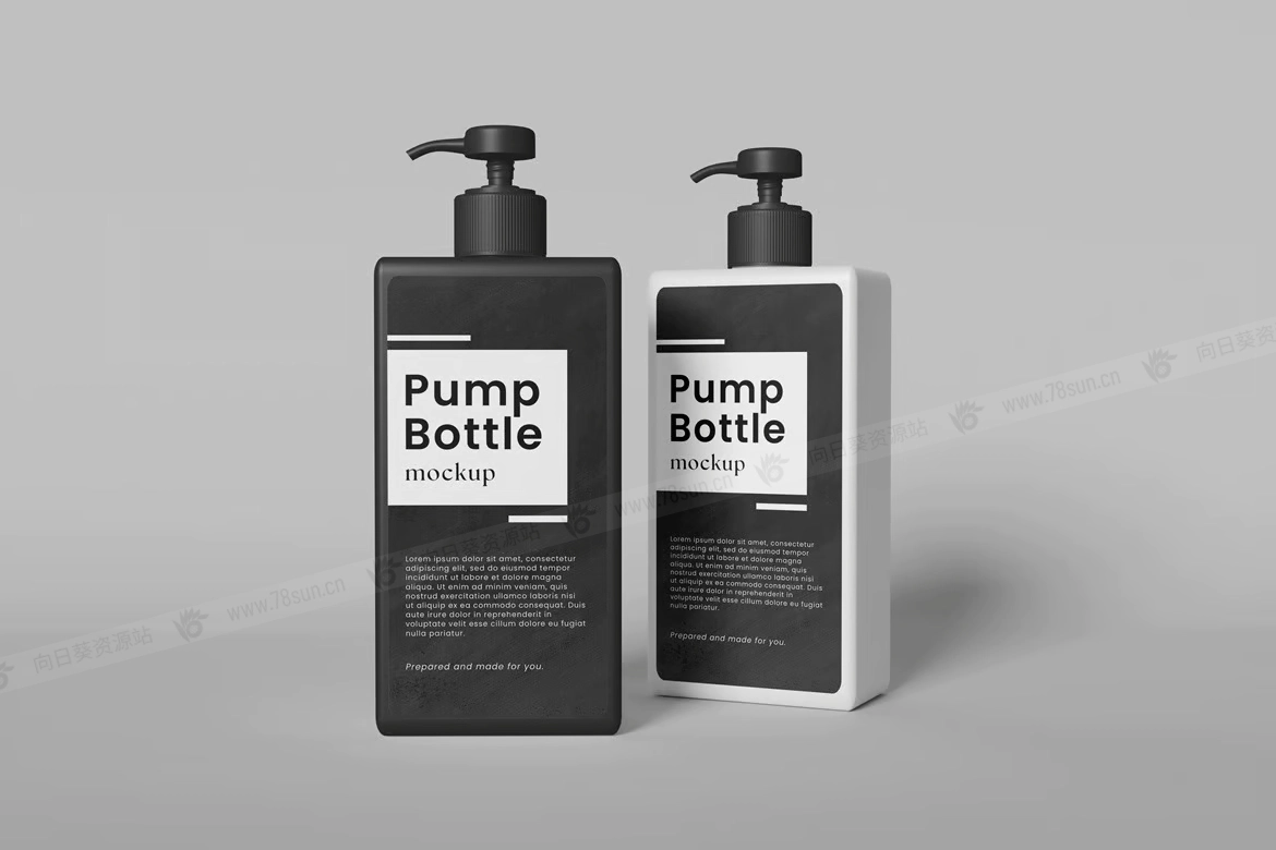 方形泵瓶洗发水沐浴露塑料瓶品牌VI效果图展示智能贴图psd设计样机。使用智能对象轻松替换您的设计,双击智能图层,复制并粘贴您的作品,保存,