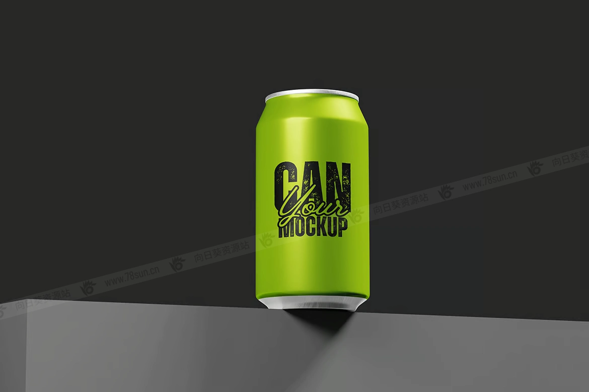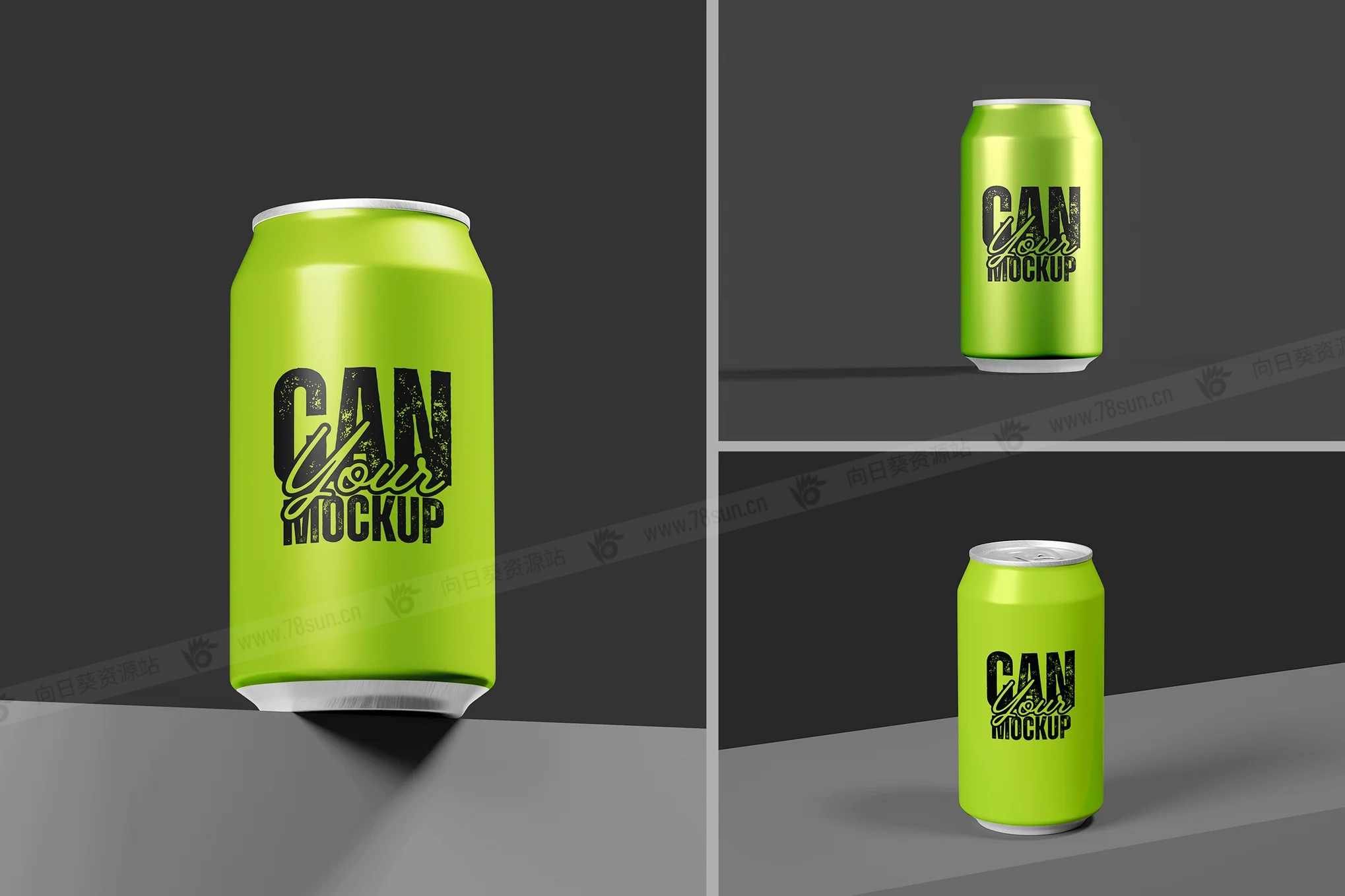 汽水饮料易拉罐头品牌VI效果图展示智能贴图psd设计样机。这款模型是软饮料、能量饮料、啤酒或食品标签展示的理想之选,