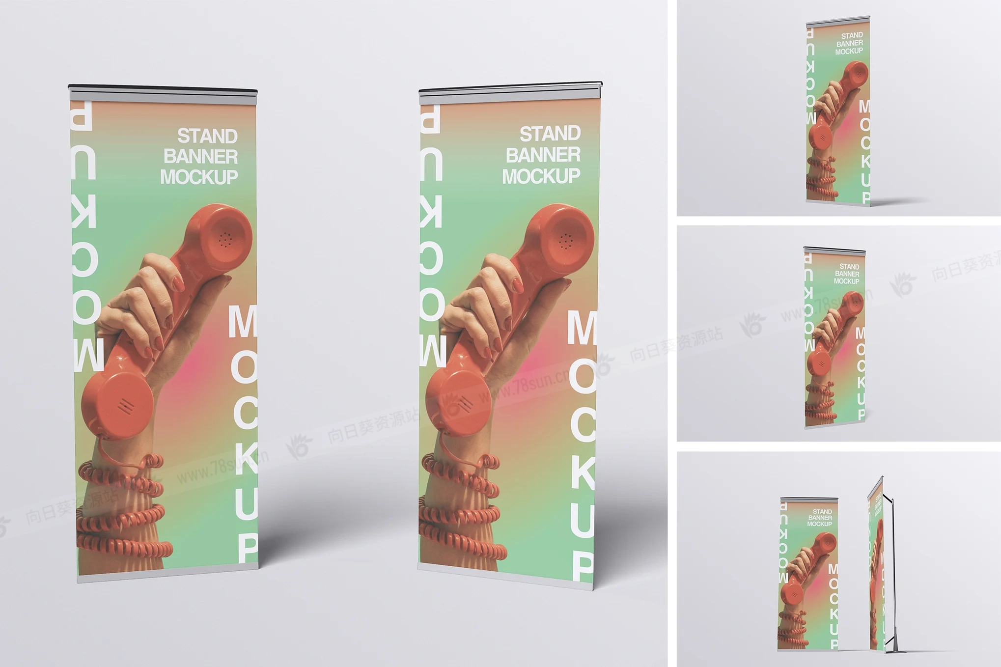 展架易拉宝品牌VI效果图展示智能贴图psd设计样机,此模型包括 04 个具有分层良好 PSD 文件并且此模型还使用智能对象功能,这意味着您可以在几秒钟内轻松快速地使用自己的设计更改当前设计。