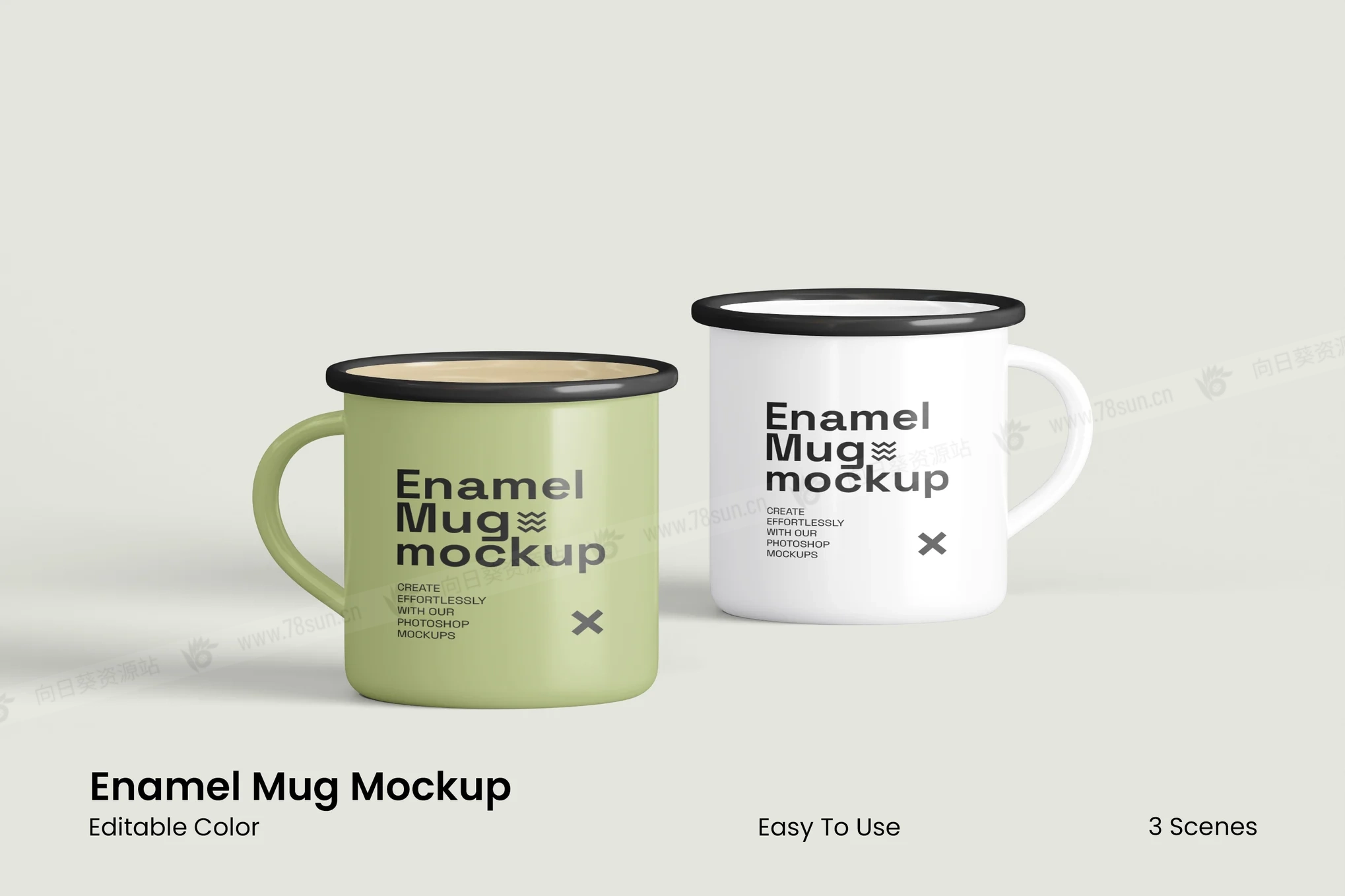 搪瓷马克杯水杯品牌VI效果图展示智能贴图psd设计样机,此模型包由 3 个其中包含精心组织的 PSD 文件,具有结构良好的图层。此外,此模型利用智能对象功能的强大功能,可在几秒钟内将现有设计轻松替换为您自己的创作。