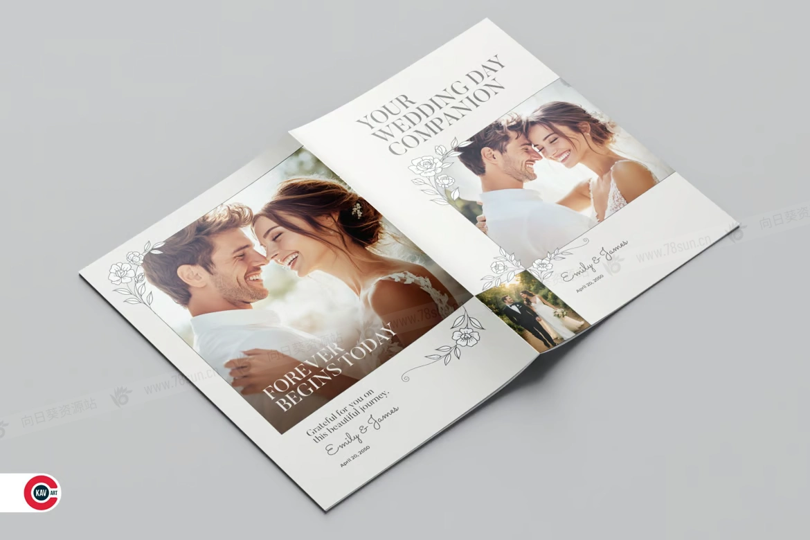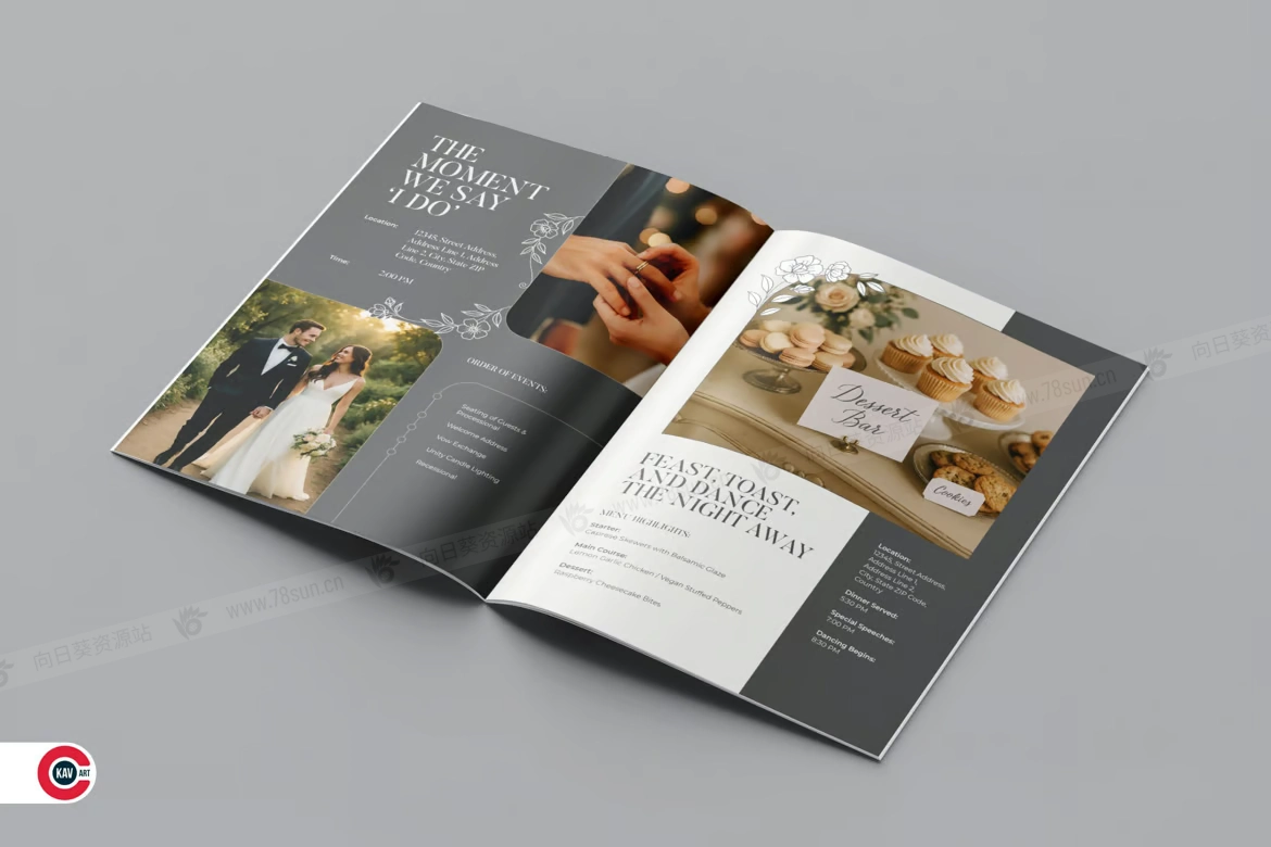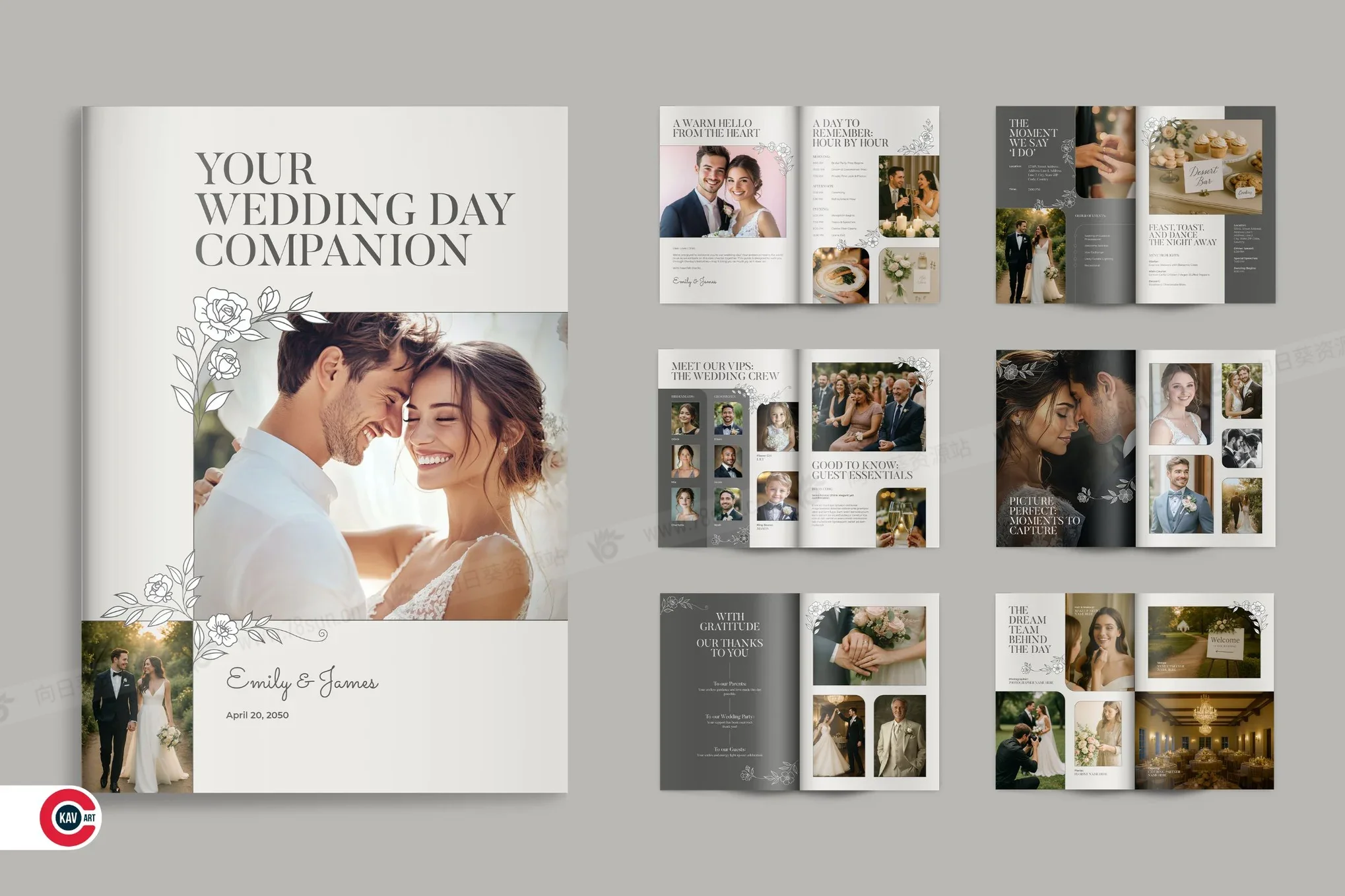 婚礼婚庆公司摄影作品集小册子杂志宣传册画册ai indd pdf设计模板,每个页面都包含精心组织的部分,例如欢迎词、婚礼时间表、仪式详细信息、接待信息、新娘派对介绍、供应商积分等。所有页面都可以在 Illustrator 或 InDesign 中完全编辑,让您可以轻松个性化文本、交换图像和调整颜色。