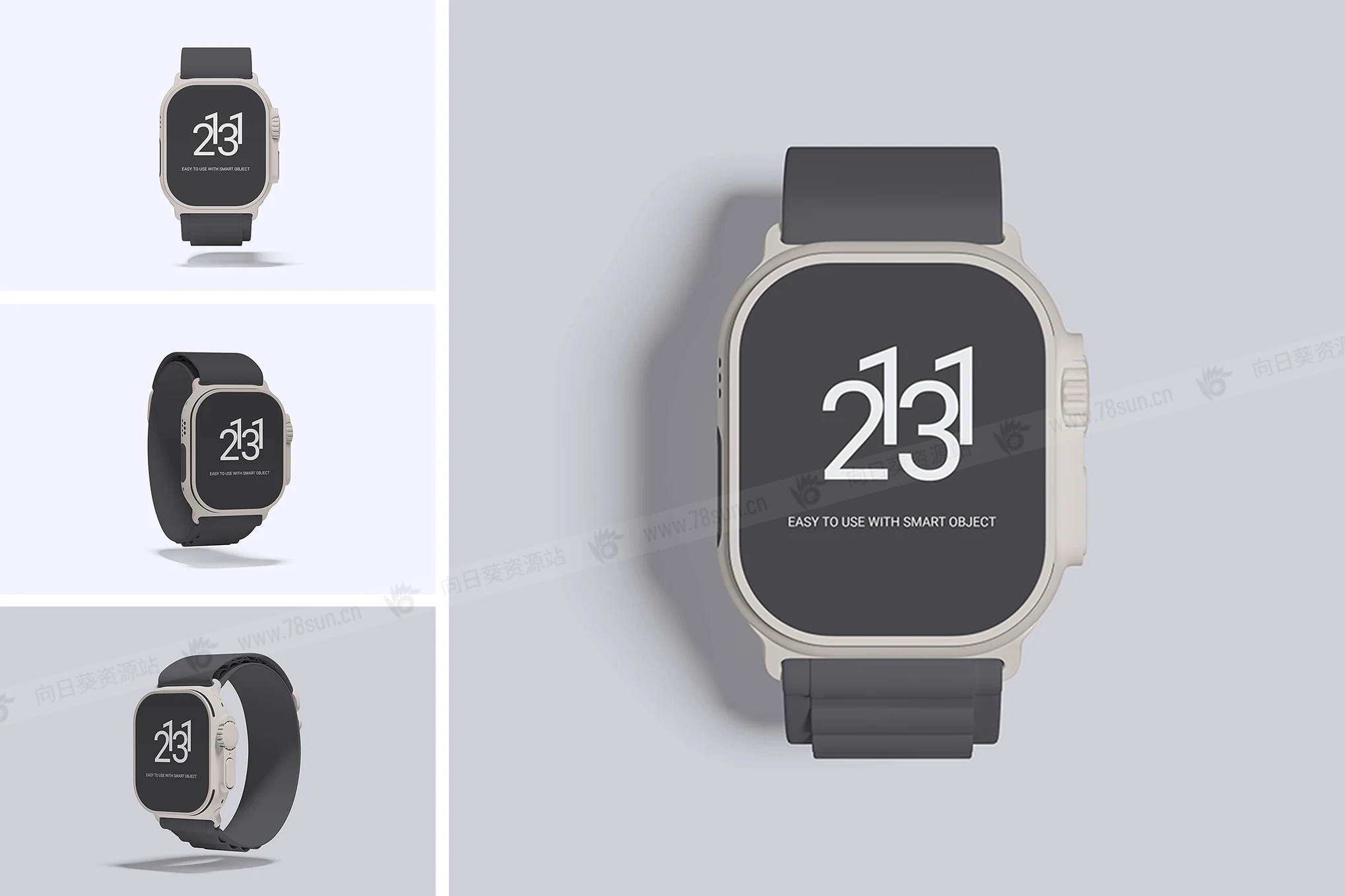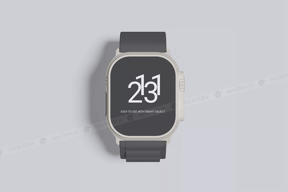 Apple Watch Ultra智能手表UI设计效果图展示智能贴图psd设计样机。此模型包括 4 个具有分层 PSD 文件并且此模型还使用智能对象功能,这意味着您可以轻松快速地更改当前只需几秒钟即可用您自己的设计。
