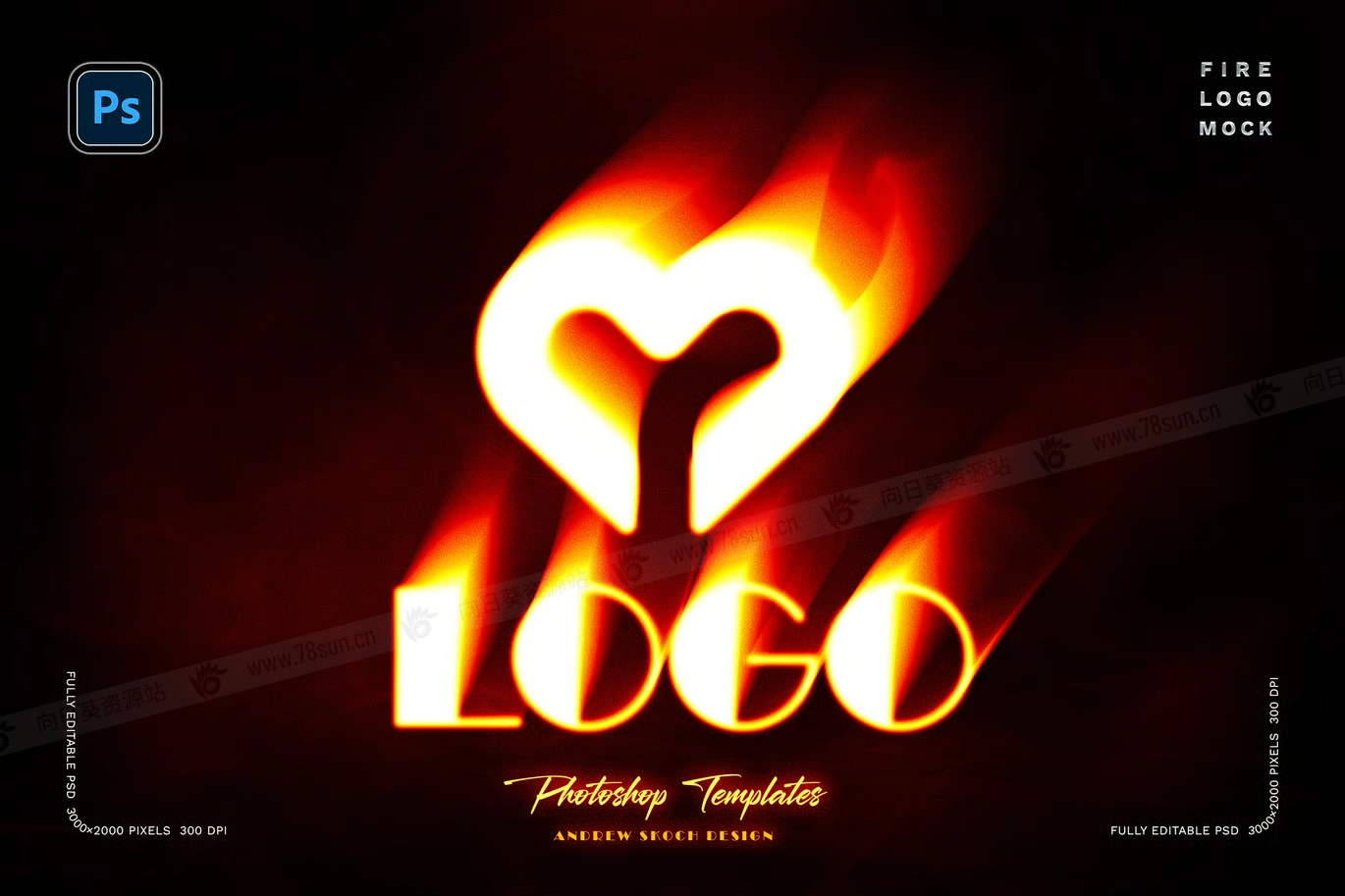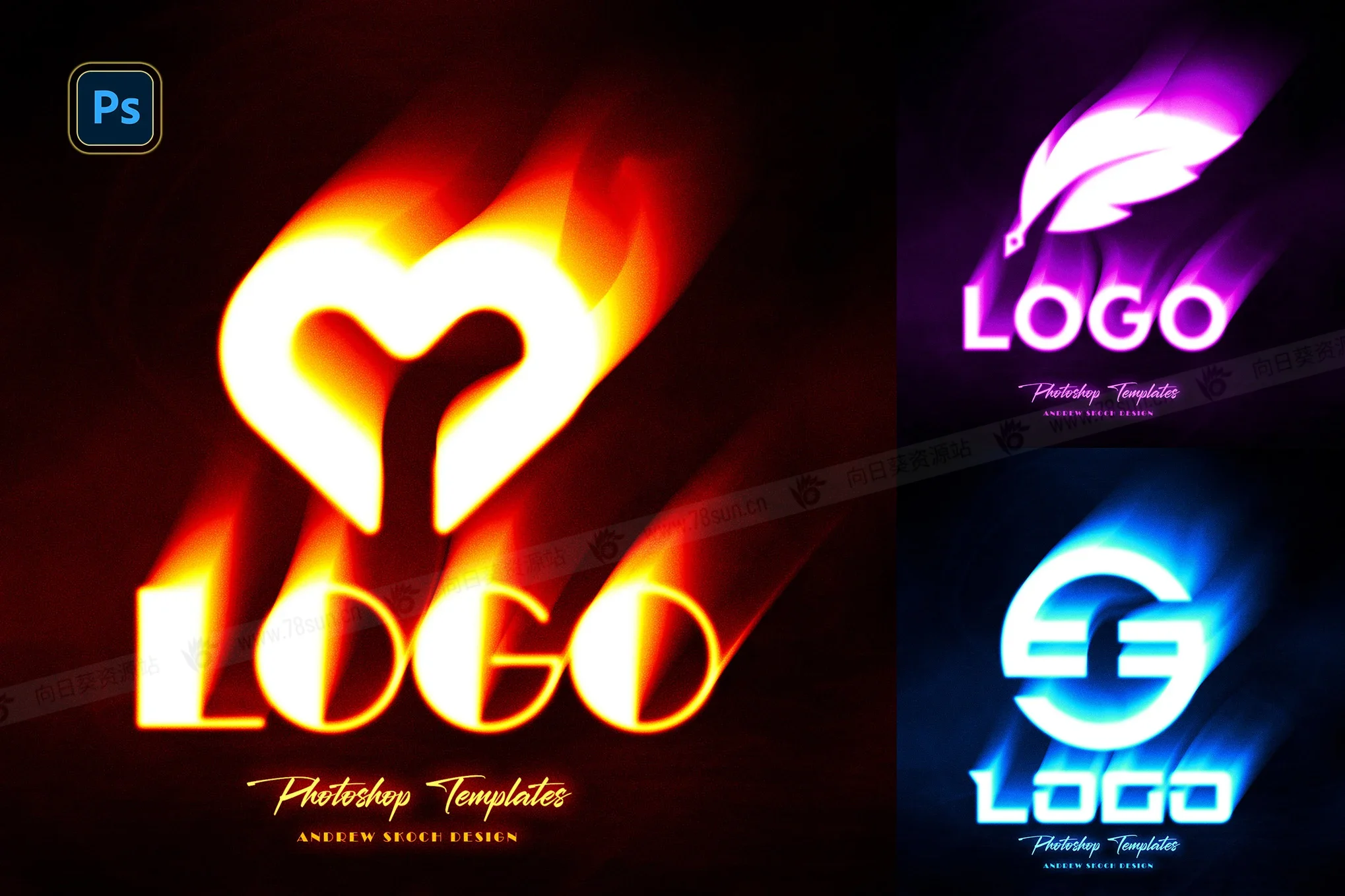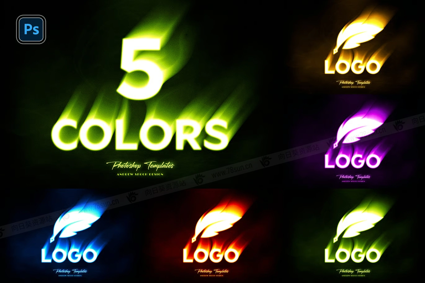 燃烧标志LOGO徽标VI效果图展示智能贴图psd设计样机,这款模型具有 5 种醒目的颜色选项(橙色、黄色、粉色、蓝色、绿色)的大胆、充满活力的火焰效果,非常适合游戏徽标、音乐品牌、前卫的演示或任何需要强大、引人注目的视觉效果的项目。