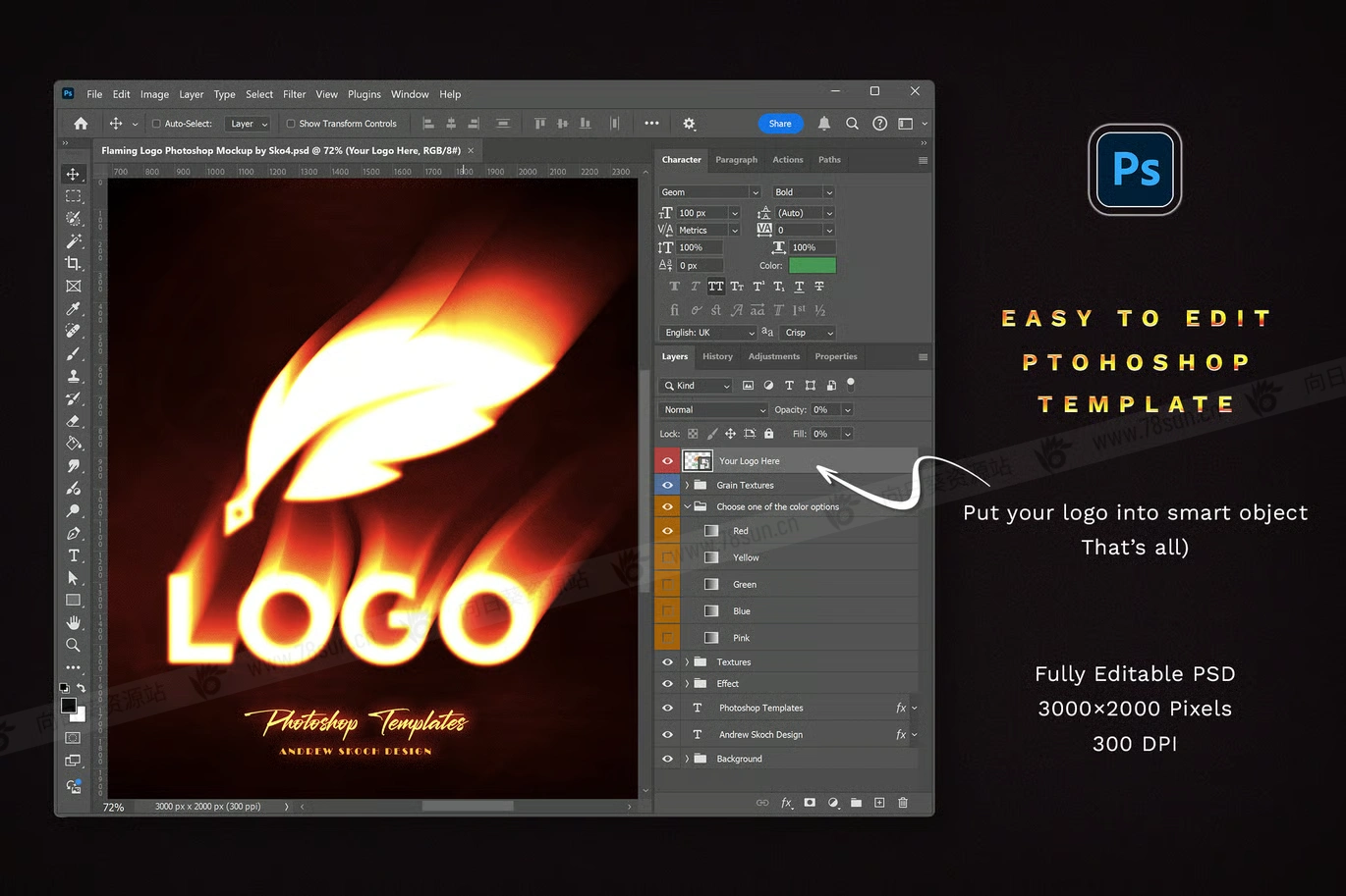 此高分辨率 PSD 模板(3000×2000 像素,300 DPI)是完全分层的,并且易于使用随附的智能对象进行自定义。只需拖放您的徽标即可立即应用火热效果。