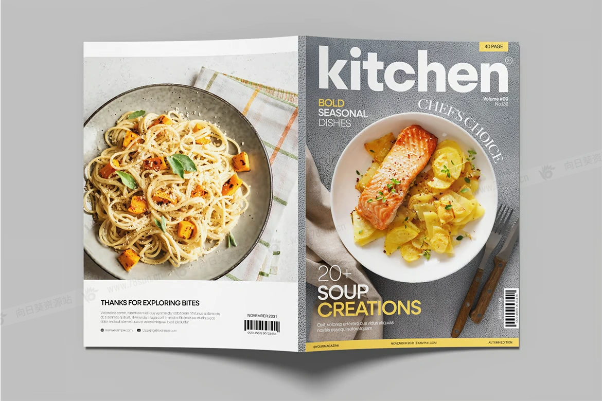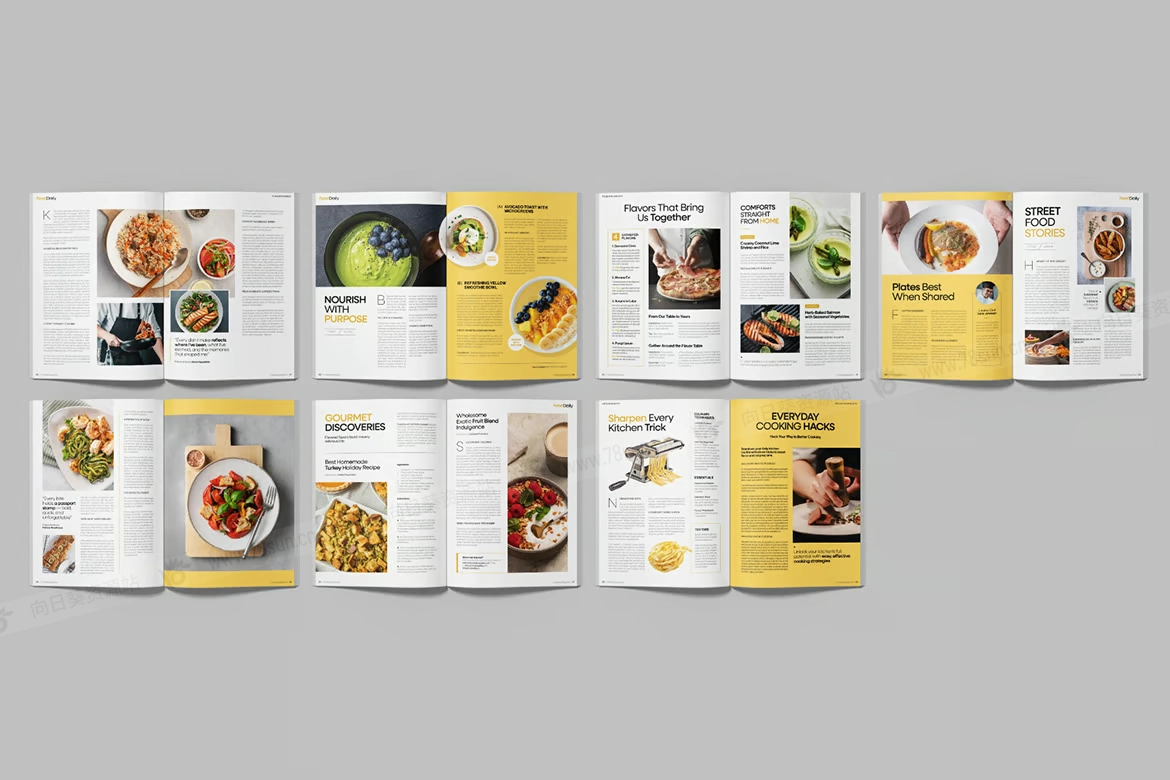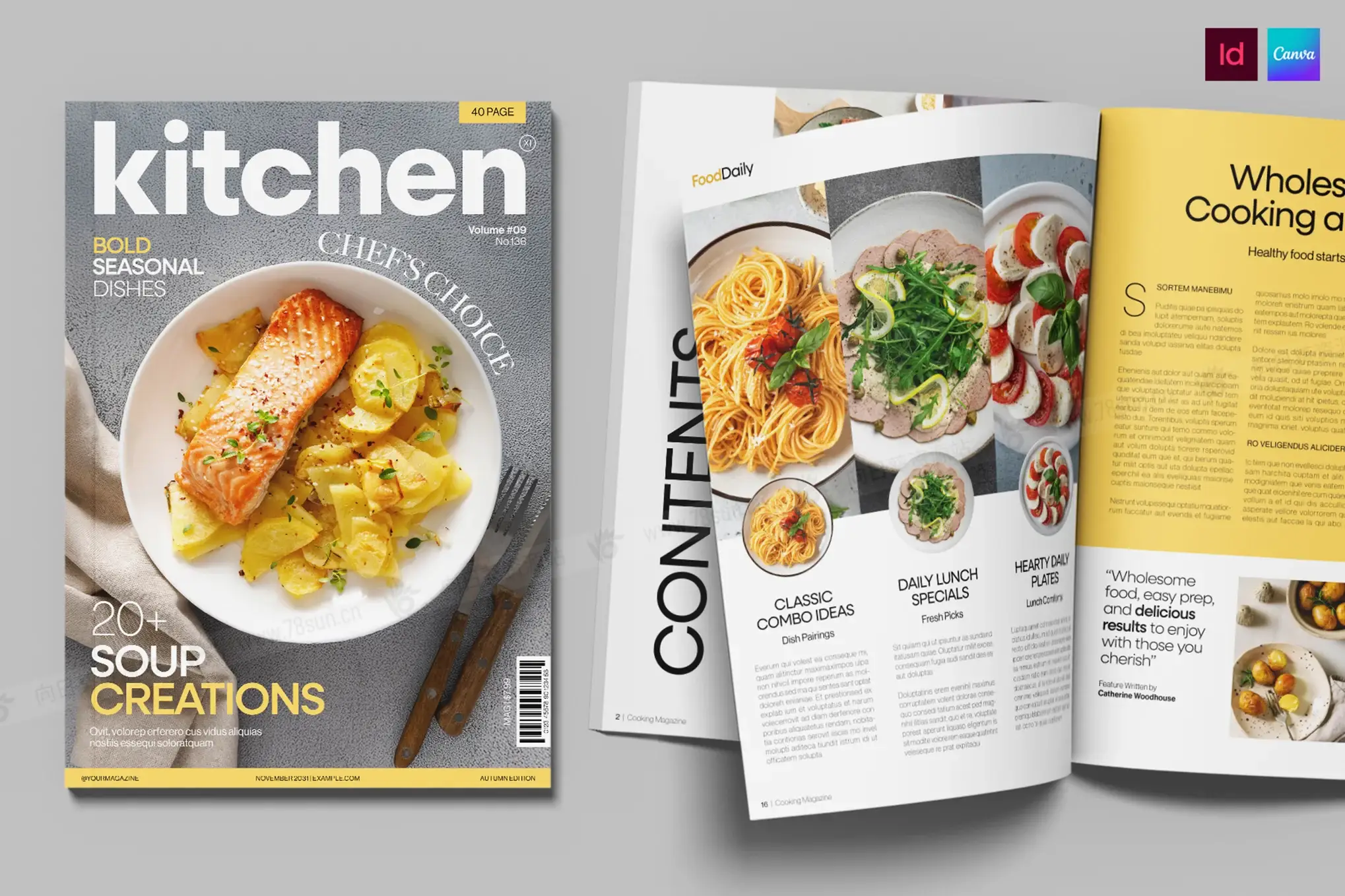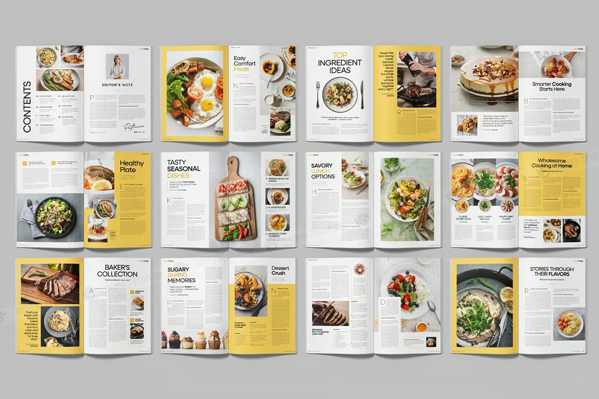 食品美食餐厅烹饪指南食谱小册子杂志宣传册画册indd设计模板,非常适合编译食谱集、创建餐厅小册子或制作引人入胜的烹饪指南。提供 Canva、InDesign IDML 和 INDD 格式,