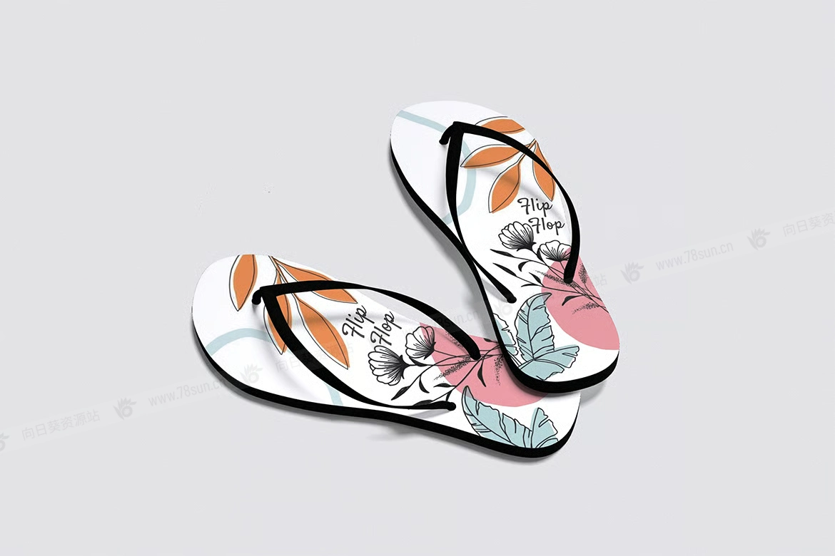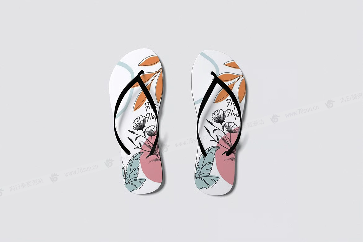 人字拖夹脚拖鞋凉鞋品牌VI效果图展示智能贴图psd设计样机,此模型包括 04 个具有分层良好 PSD 文件,并且此模型还使用智能对象功能,这意味着您可以在几秒钟内轻松快速地使用自己的设计更改当前设计。