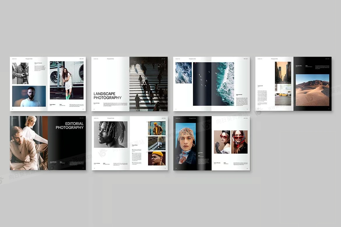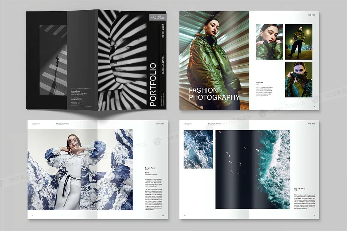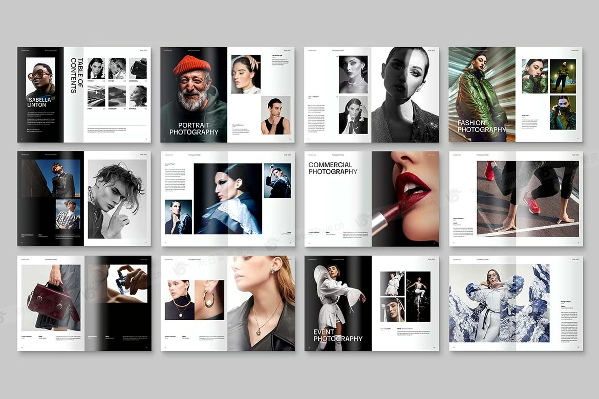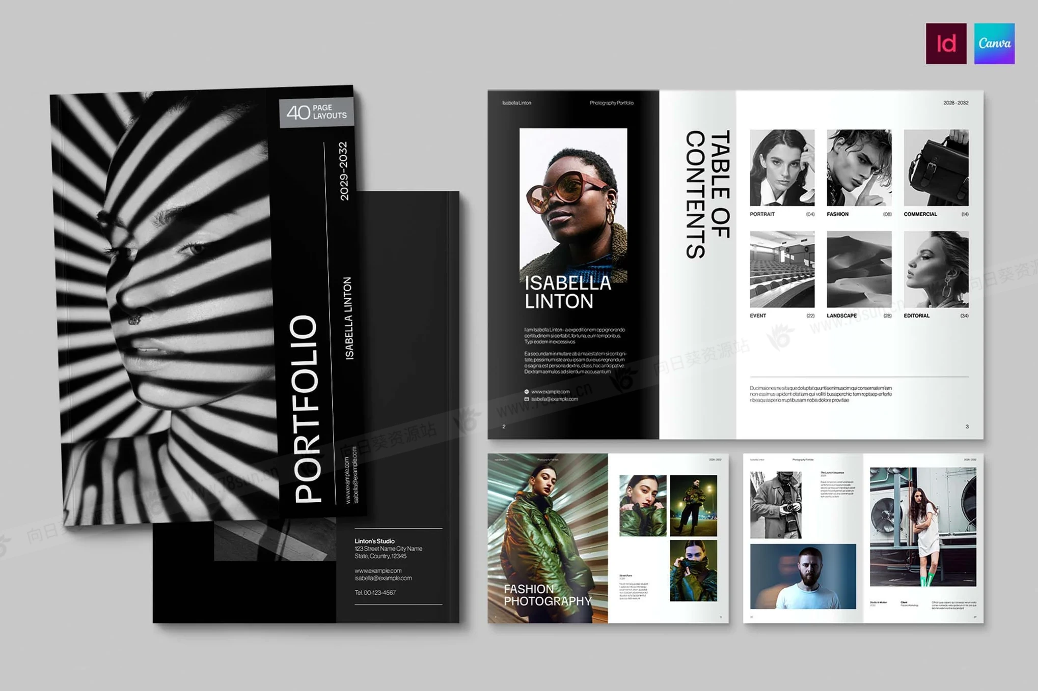 时尚摄影作品集相册小册子杂志宣传册画册indd设计模板,有 Canva、InDesign IDML 和 INDD 格式,提供 40 种制作精美的页面布局,