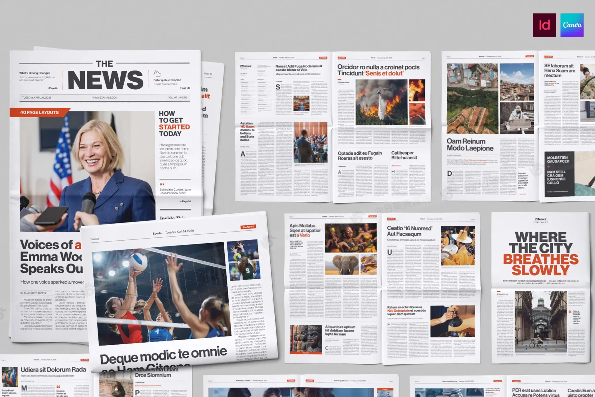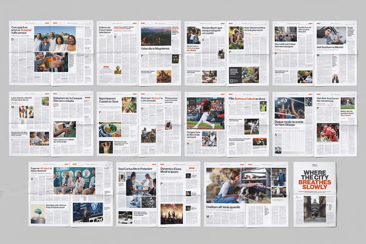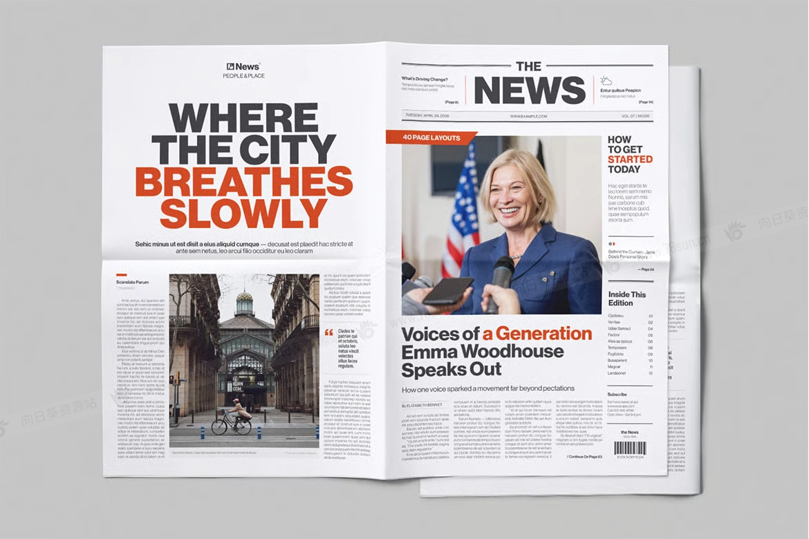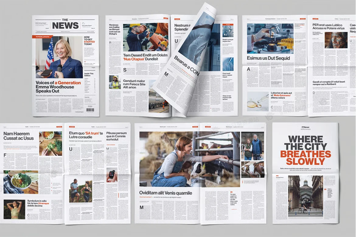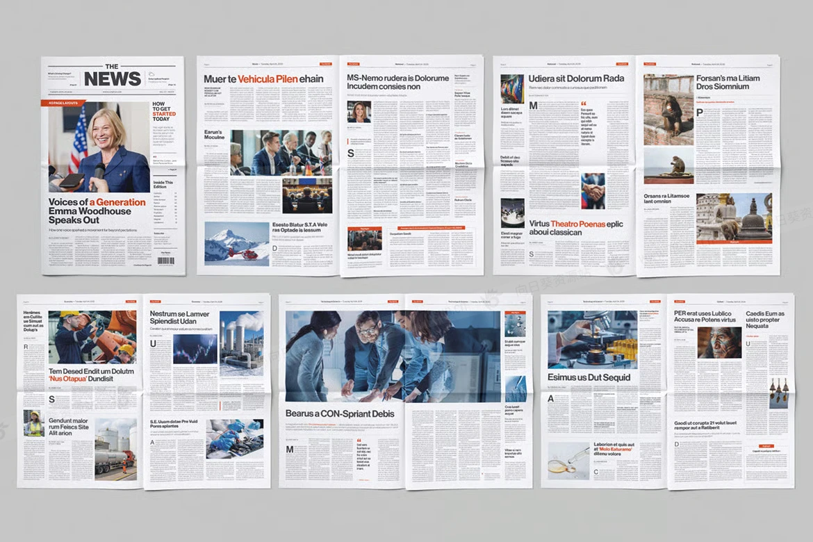 商务新闻报纸公告宣传时事通讯杂志画册indd设计模板,非常适合各种报纸设计:小报、大报和时事通讯。它专为 Canva 和 InDesign(IDML、INDD)量身定制,