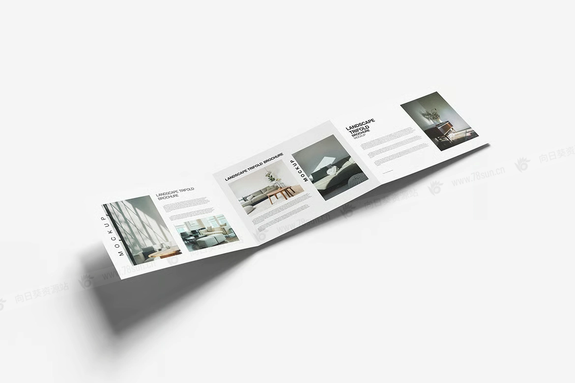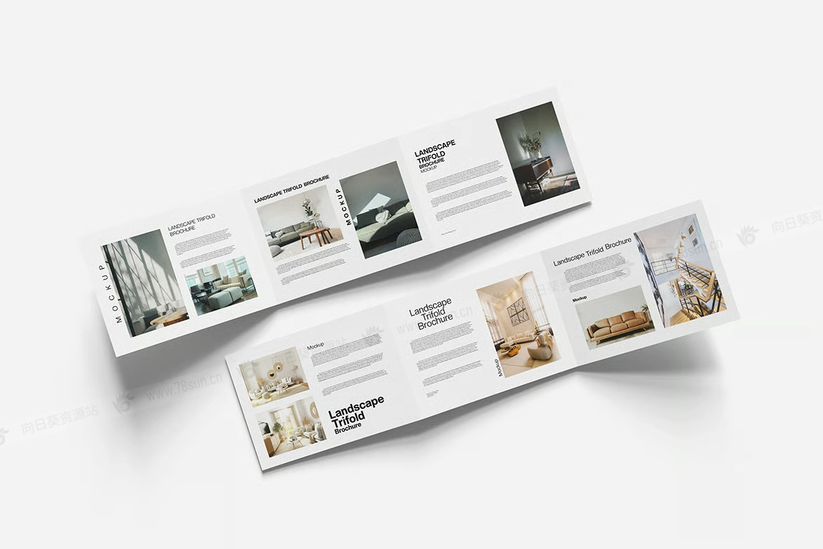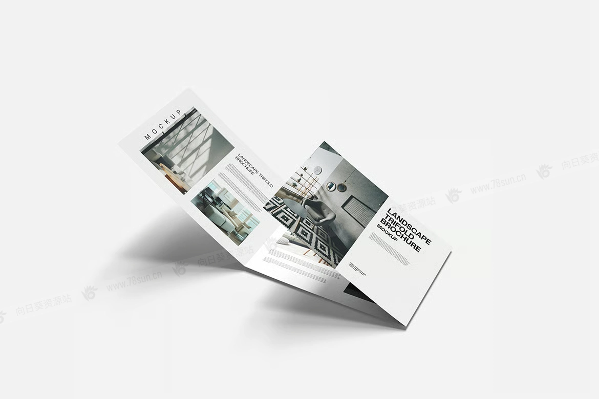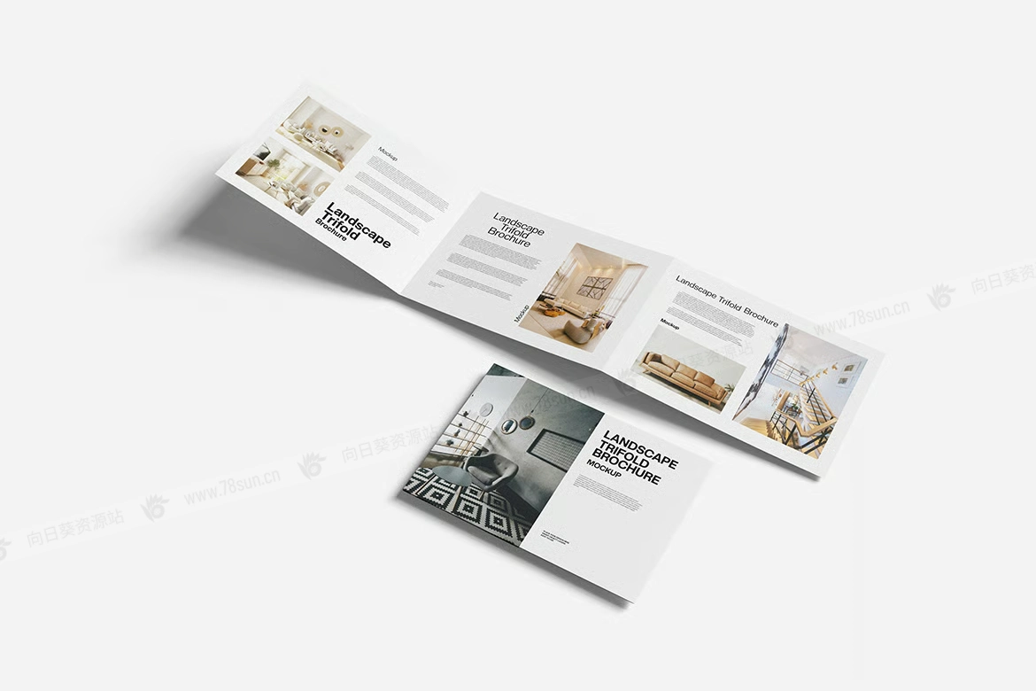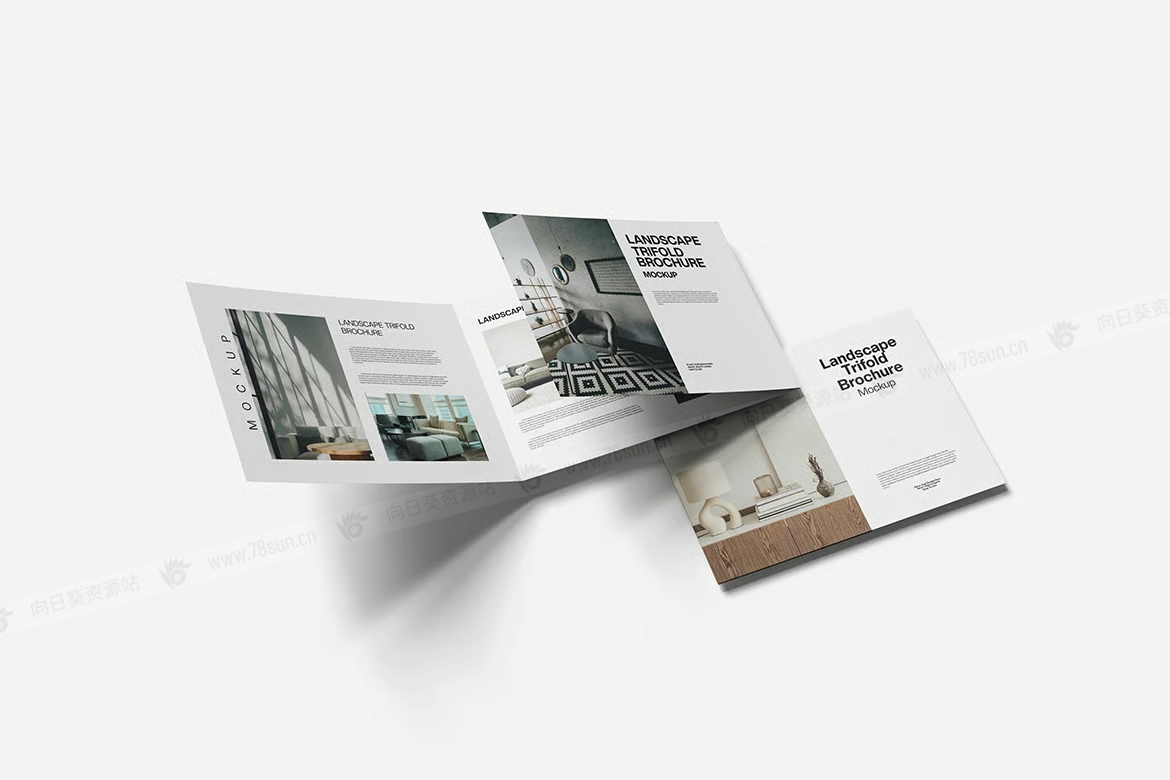 横版三折页产品宣传小册子VI效果图展示智能贴图psd设计样机,使用智能对象功能轻松快速地替换设计。以 PSD Photoshop 格式提供,具有智能对象功能,可帮助您在几秒钟内将当前设计替换为自己的设计。