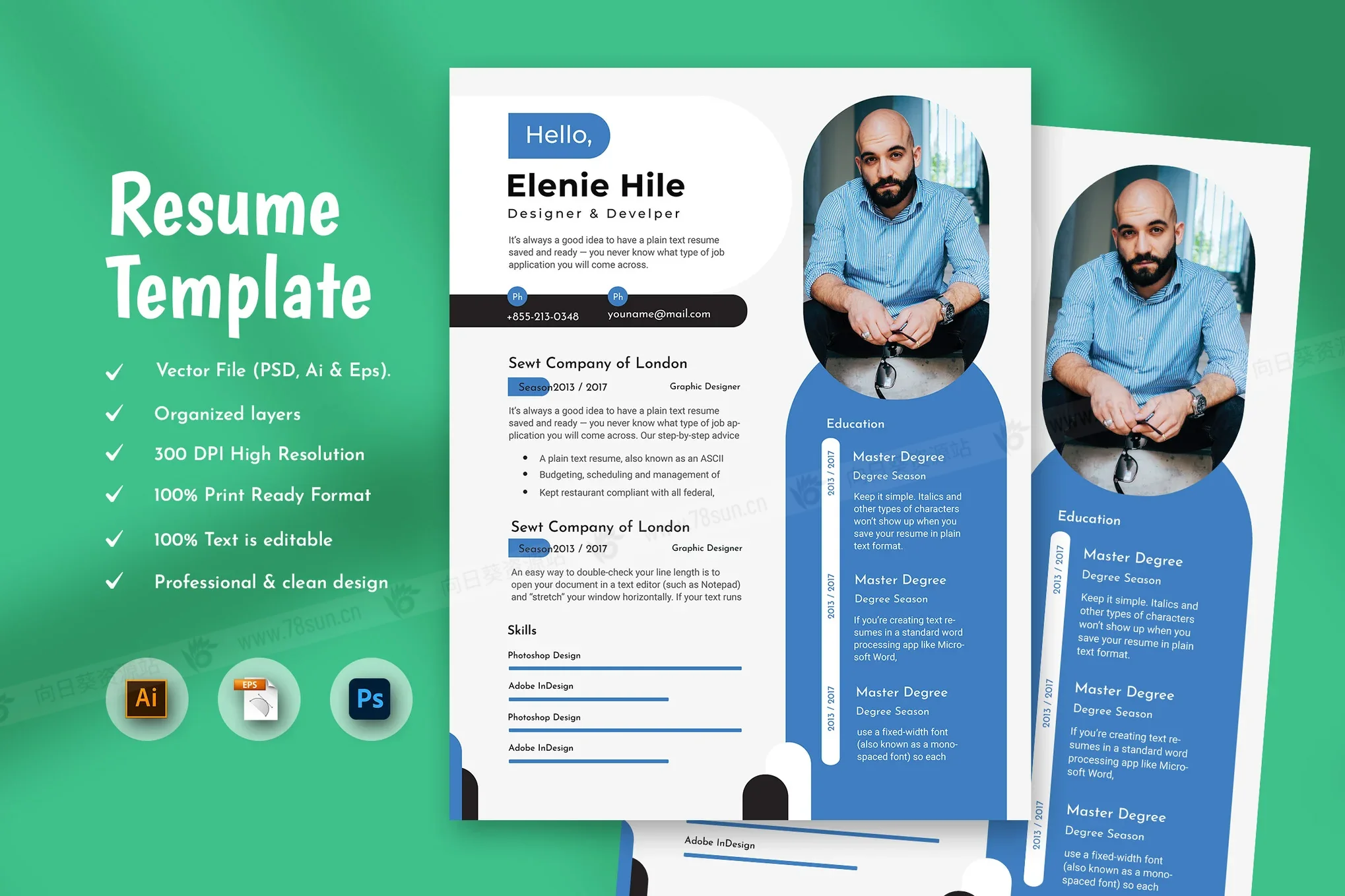 创意面试resume个人简历psd ai设计模板,简历模板和求职信采用简洁现代的设计,以突出您的技能、经验和成就。它采用现代风格的时间线设计,以展示您以前的经验。