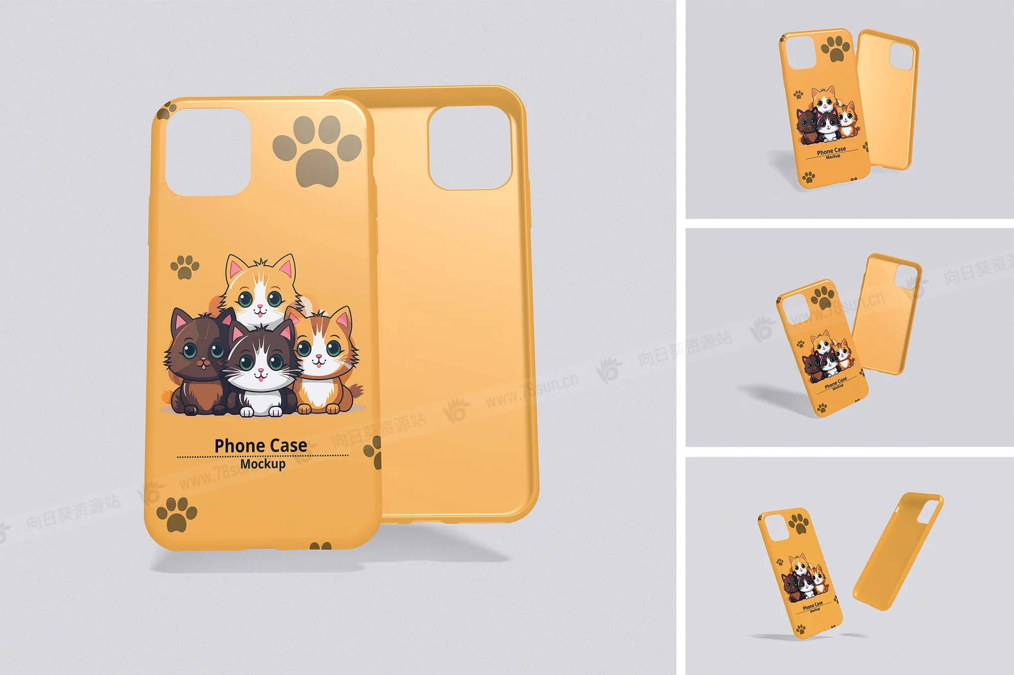 手机壳品牌VI效果图展示智能贴图psd设计样机,此模型包括 04 个具有分层良好的 PSD 文件,并且此模型还使用智能对象功能,这意味着您可以在几秒钟内轻松快速地使用自己的设计更改当前设计。