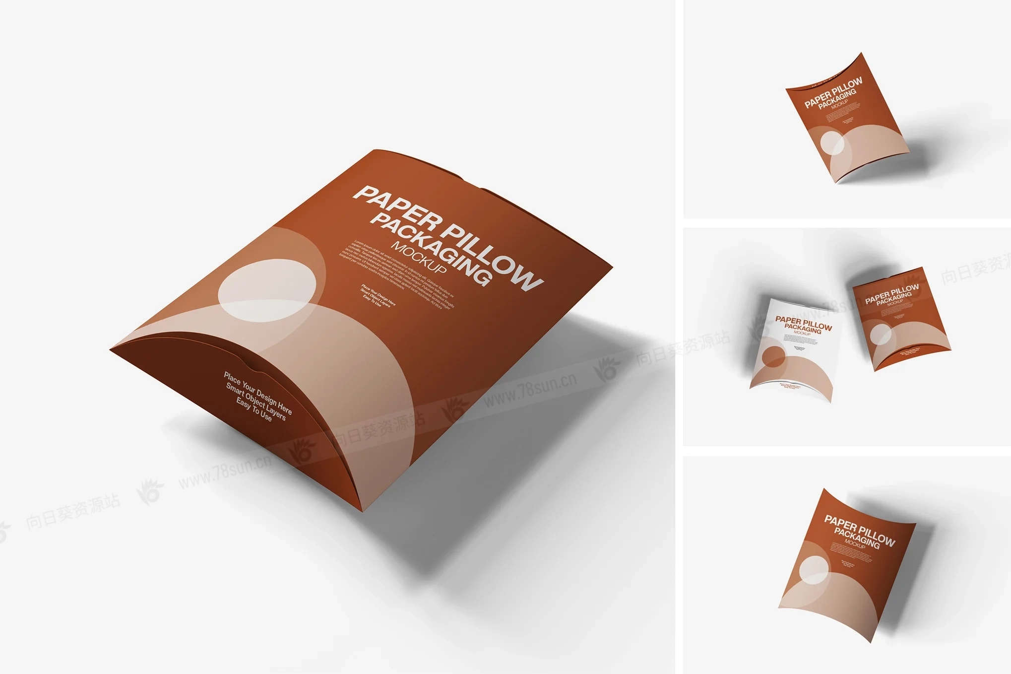 牛皮纸枕头形礼品包装盒VI效果图展示智能贴图psd设计样机,纸枕盒包装模型提供 PSD Photoshop 格式,具有智能对象功能,可帮助您在几秒钟内将当前设计替换为自己的设计。