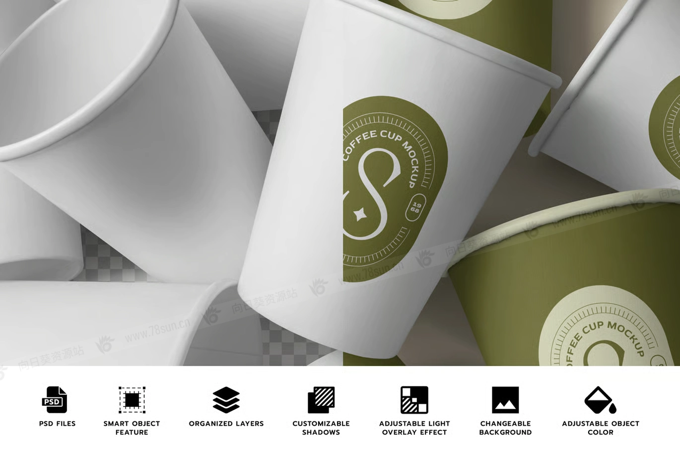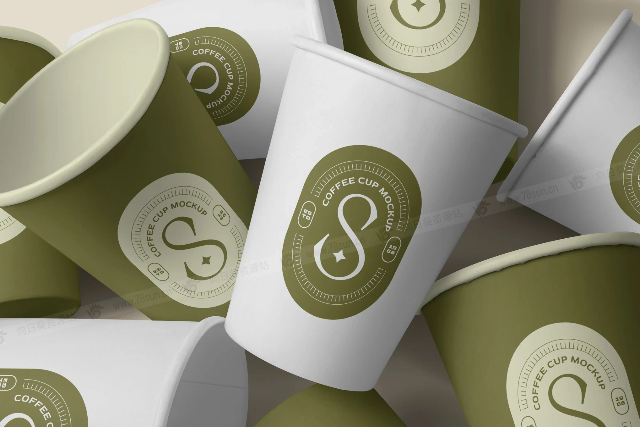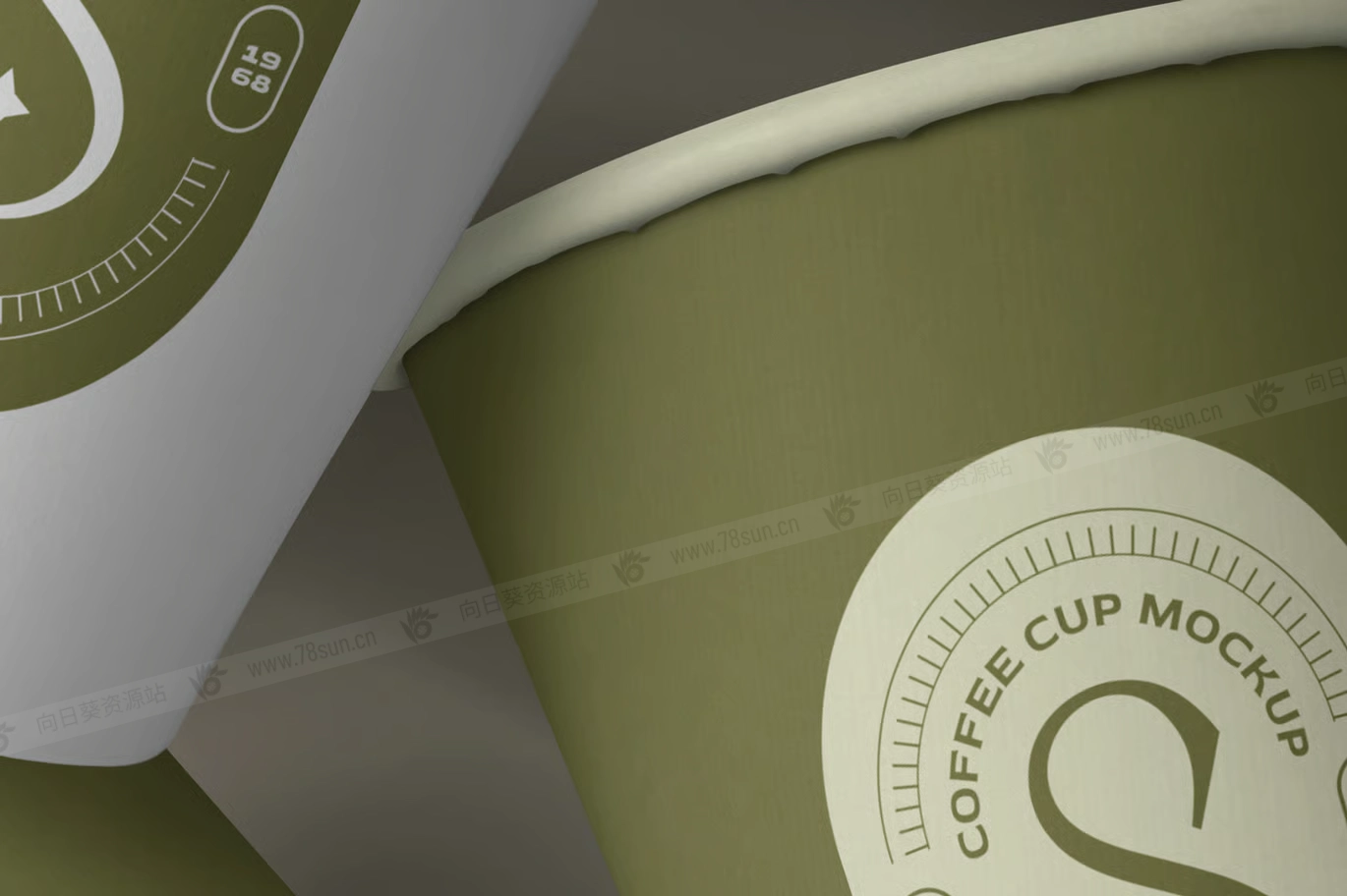 咖啡杯纸杯品牌VI效果图展示智能贴图psd设计样机,使用智能对象,因此您只需单击几下即可从内到外更改杯子的设计和颜色。此外,您可以选择与您的氛围相匹配的背景颜色,或者完全放弃它以获得干净、独立的外观。