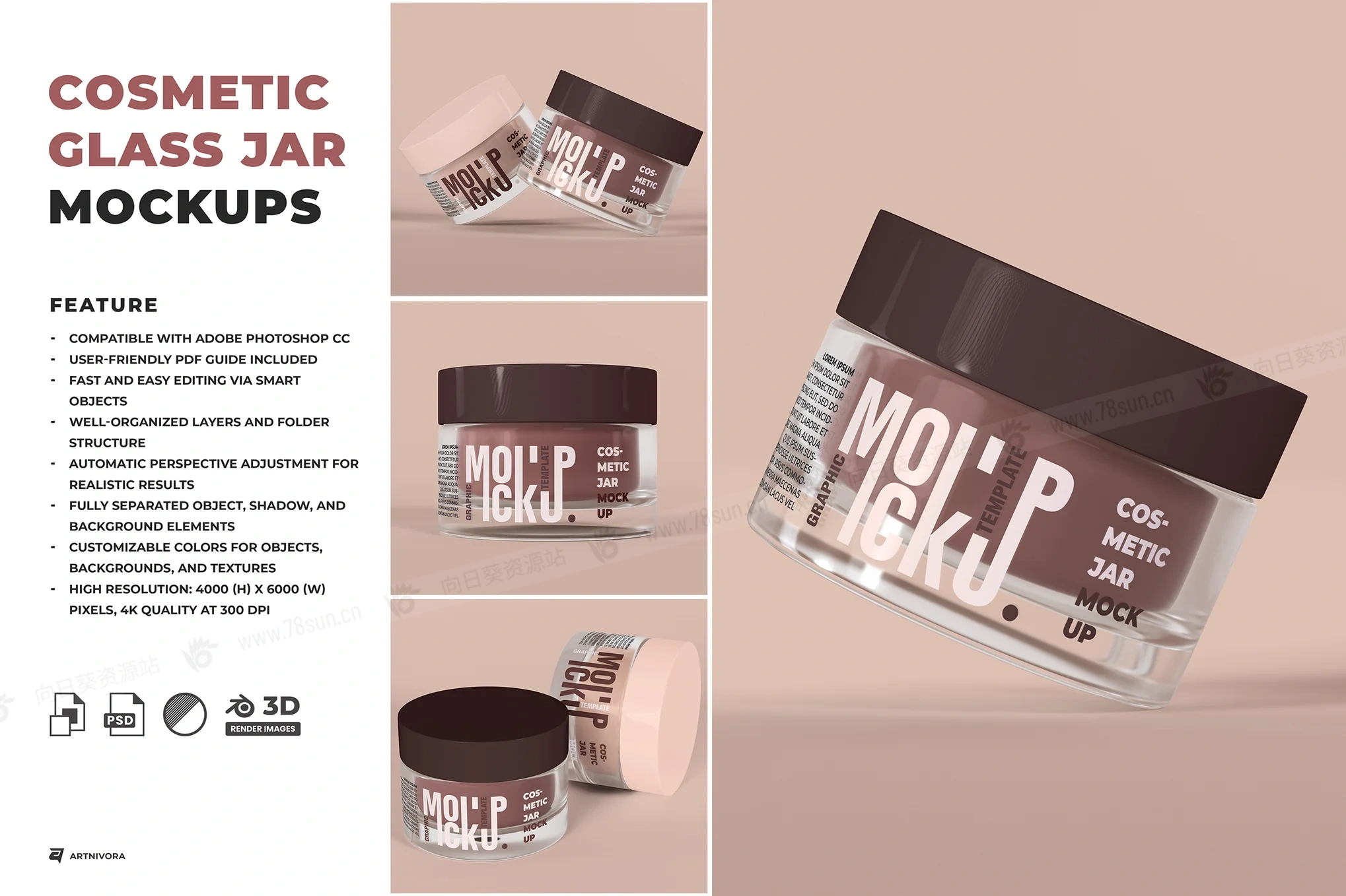 化妆品面霜玻璃罐品牌VI效果图展示智能贴图psd设计样机。这些 PSD 文件专为终极自定义而设计,使用智能对象进行轻松编辑 – 只需拖放您的图稿即可。所有对象、阴影和背景都完全分离,让您可以完全控制更改颜色、纹理和布局。 非常适合以逼真和专业的方式展示护肤、美容或健康包装。