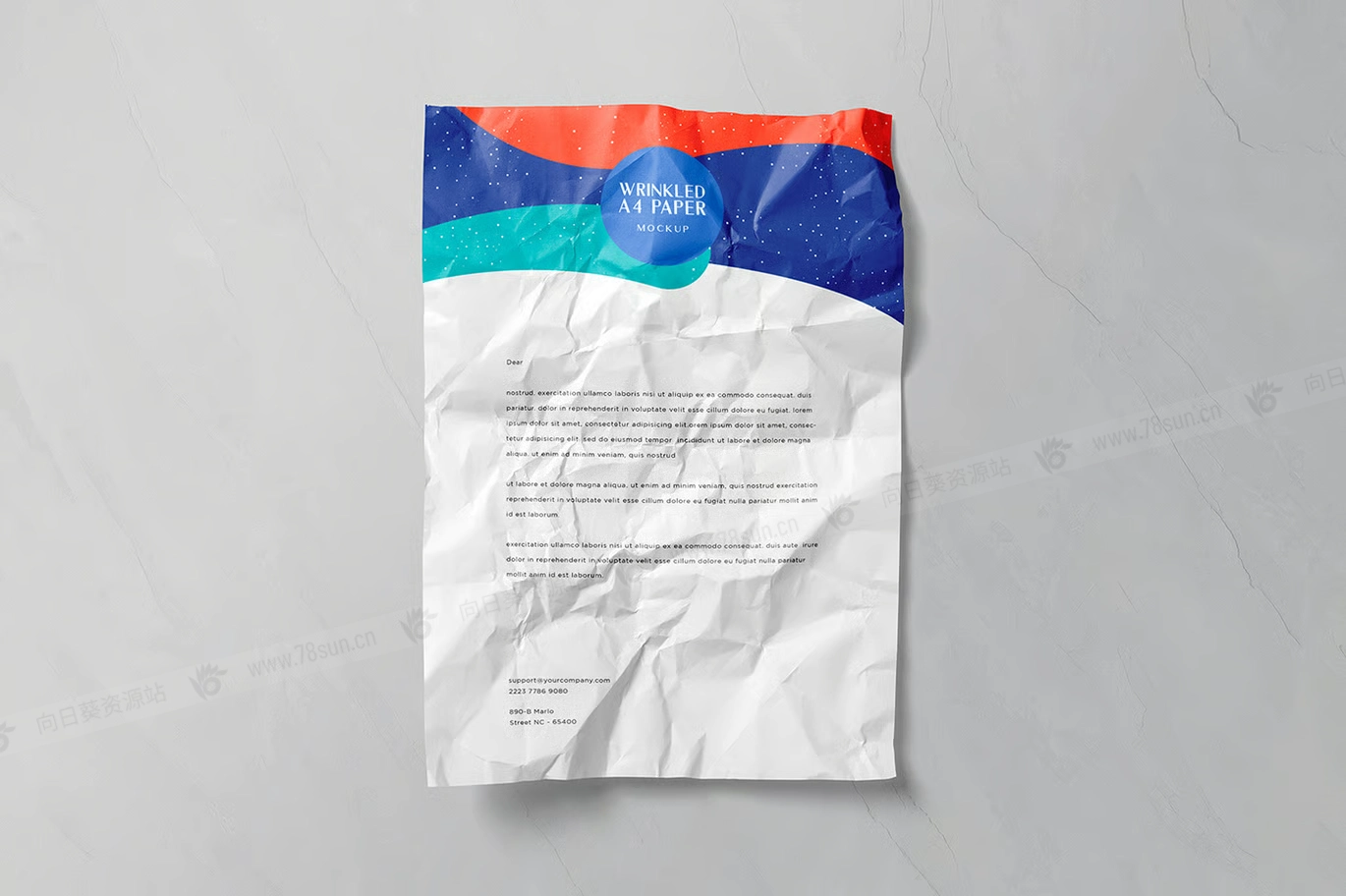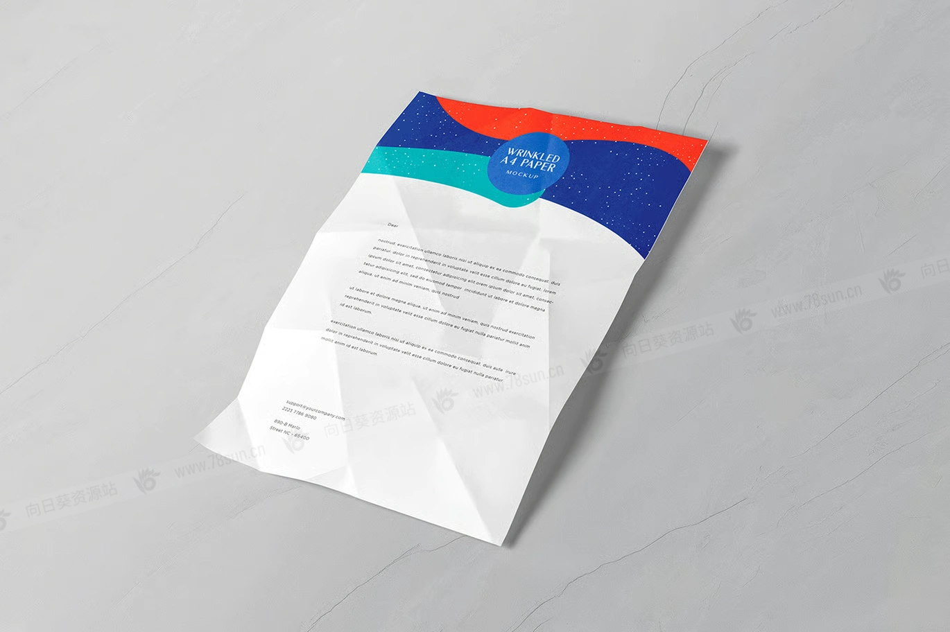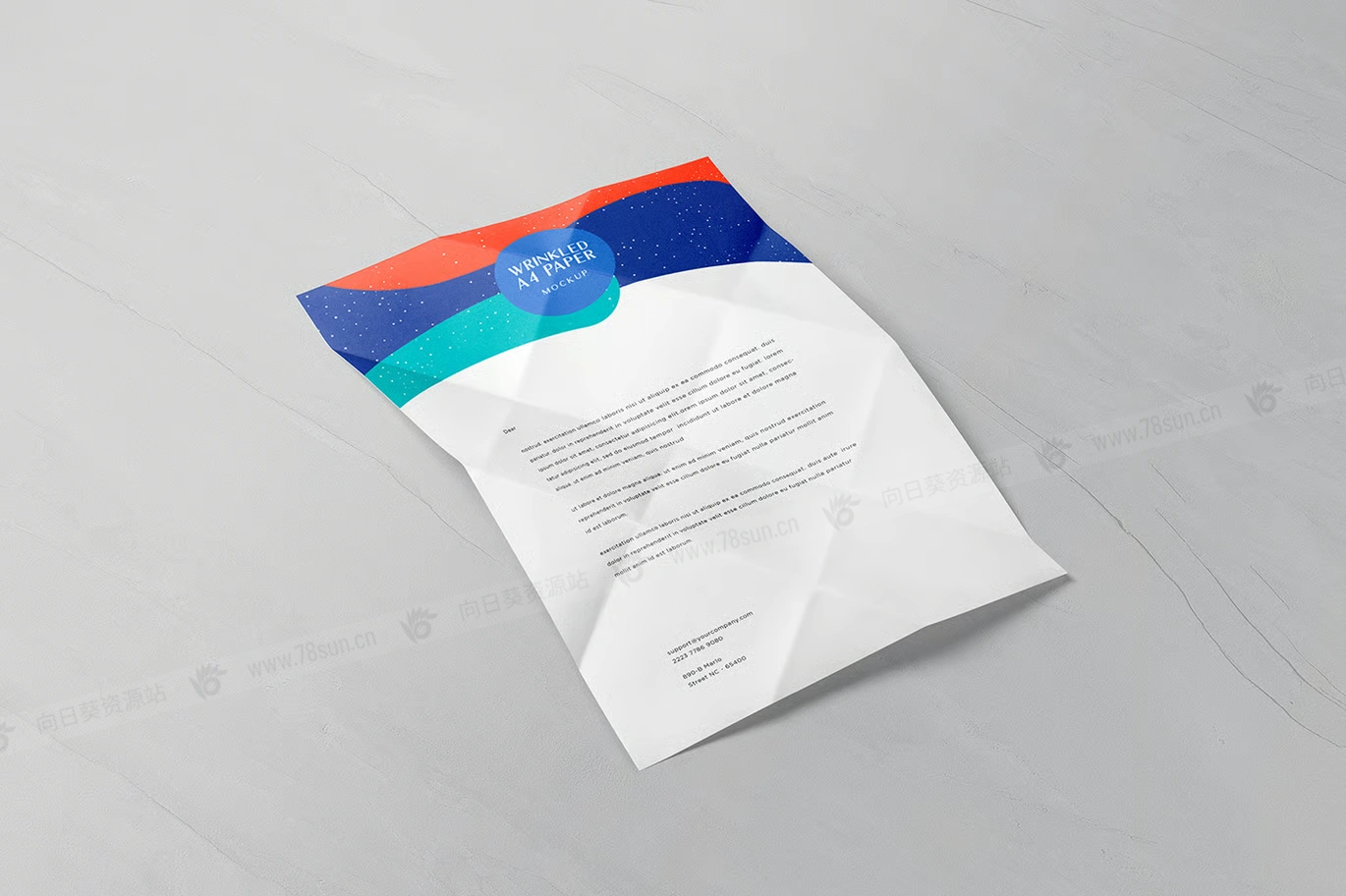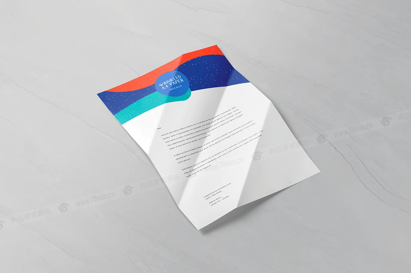 皱巴巴的纸张海报广告宣传单品牌VI效果图展示智能贴图psd设计样机。这个皱巴巴的纸模型包括智能对象图层和详细的纹理,增加了深度和真实感。