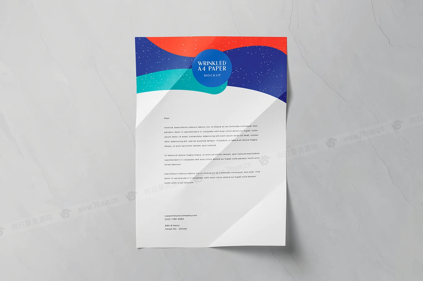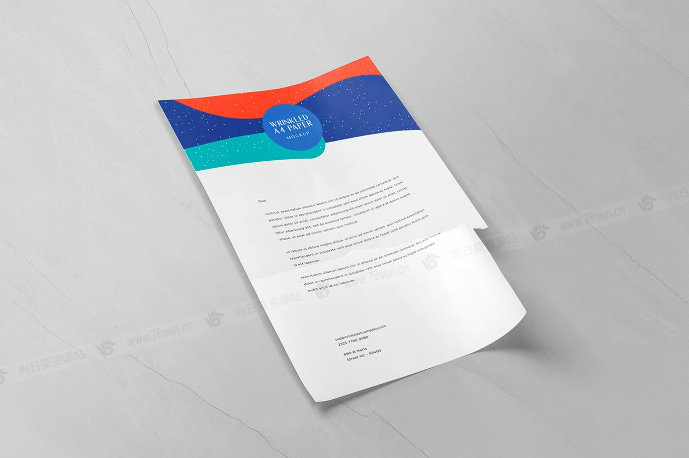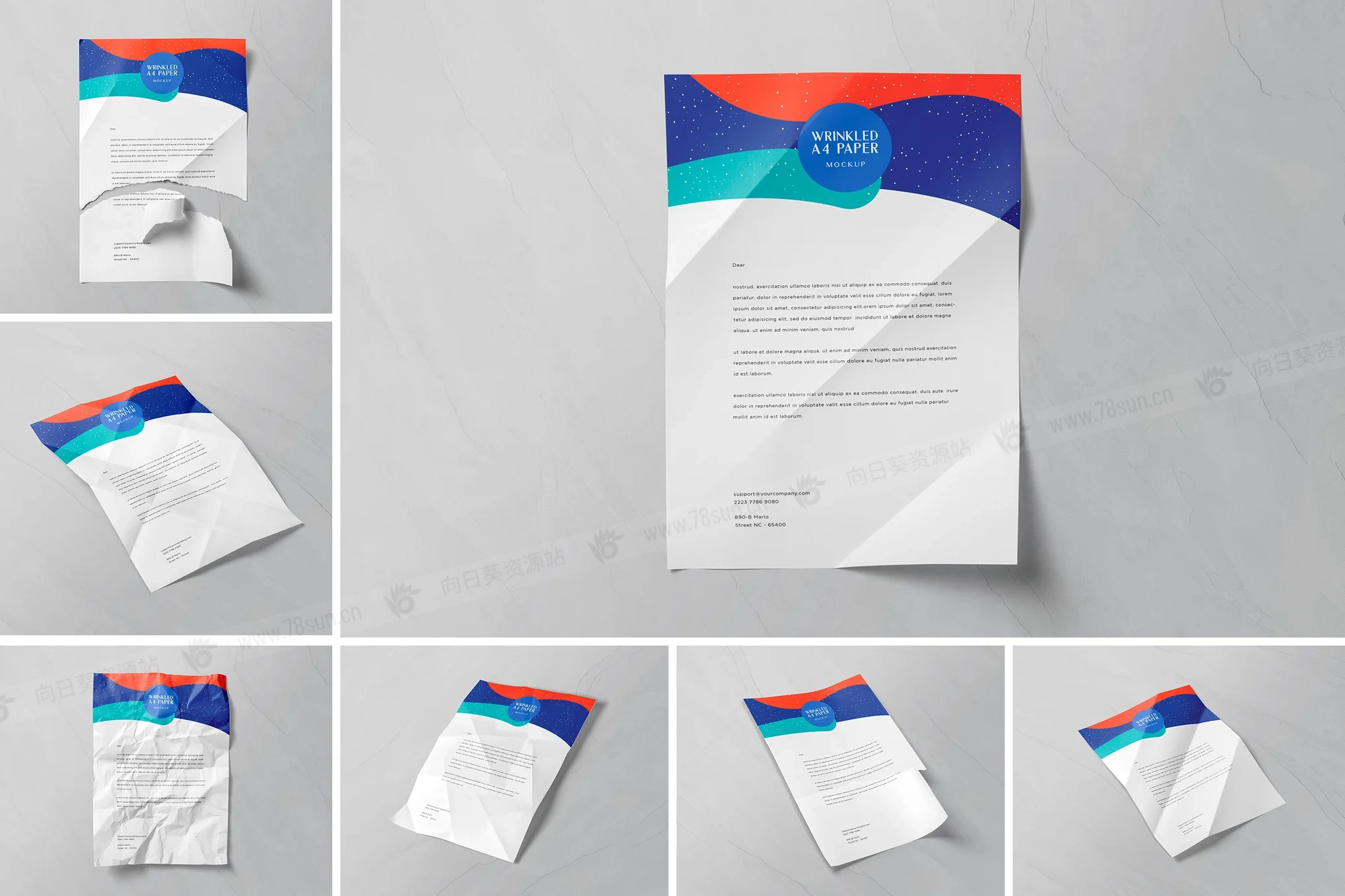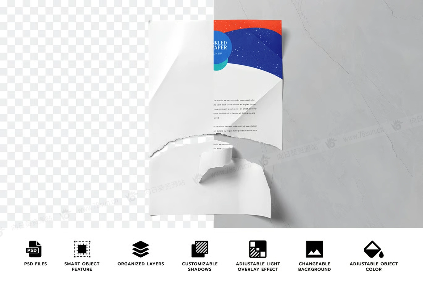 皱巴巴的纸张海报广告宣传单品牌VI效果图展示智能贴图psd设计样机。这个皱巴巴的纸模型包括智能对象图层和详细的纹理,增加了深度和真实感。