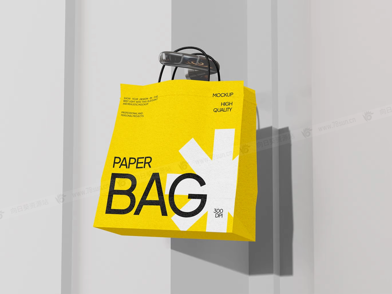 纸质手提袋购物袋品牌VI效果图展示智能贴图psd设计样机,非常适合在悬挂视图中展示零售包装、环保品牌或定制袋设计。