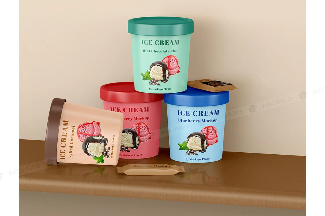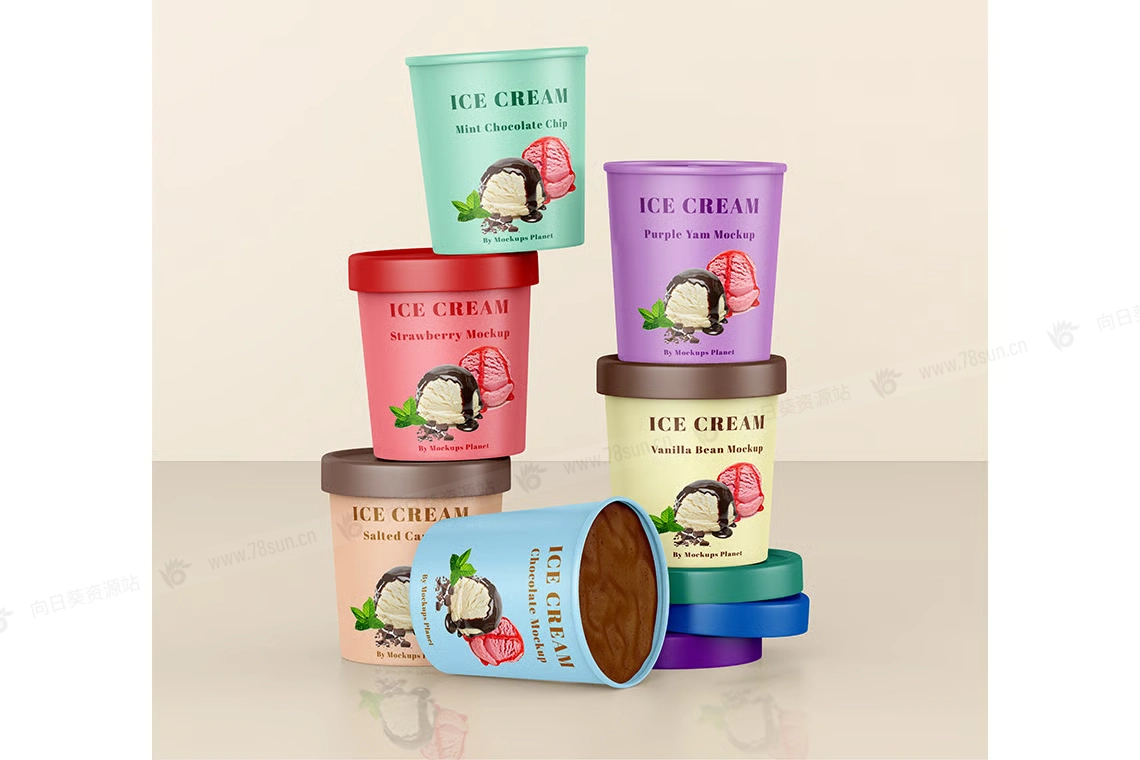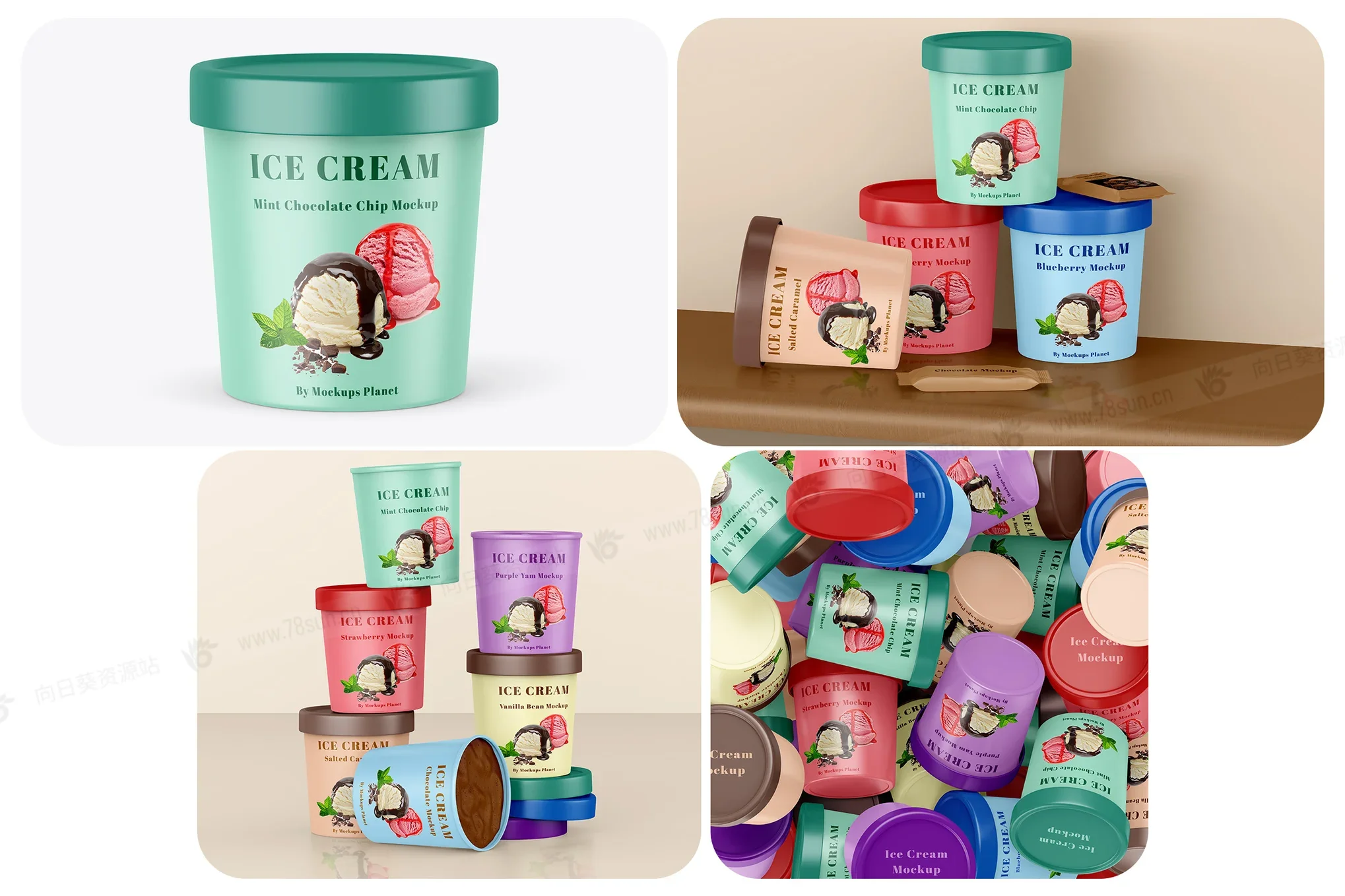 桶装冰淇淋纸杯品牌VI效果图展示智能贴图psd设计样机,包括 4 个完全可编辑的 PSD 文件,每个模型都有 6000×6000 像素的分辨率,轻松自定义杯子和瓶盖颜色,通过智能对象插入您的设计,调整阴影,并更改背景颜色以完美匹配您的项目。