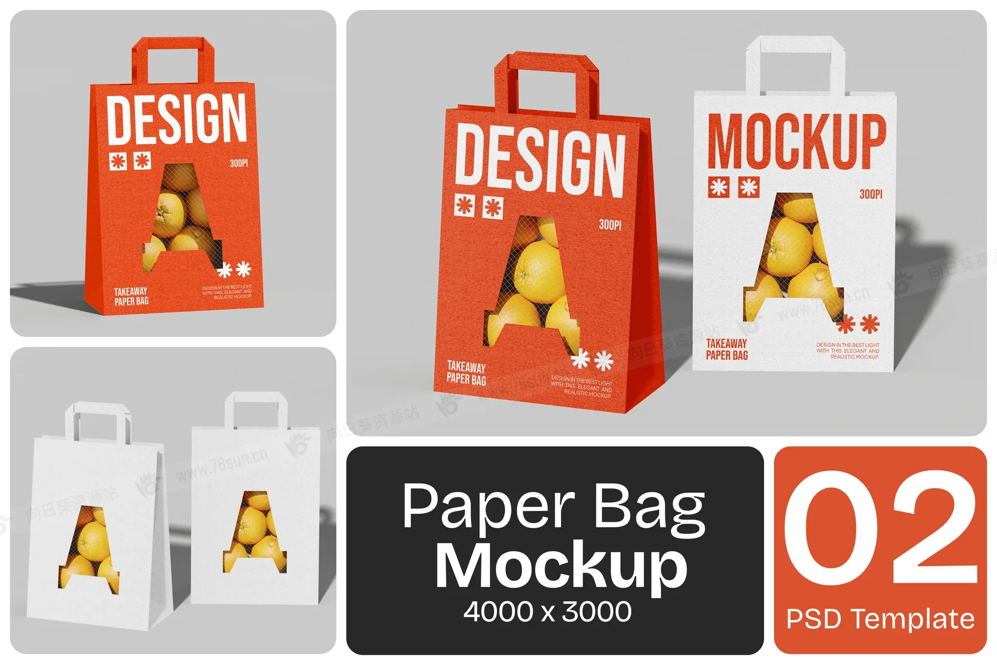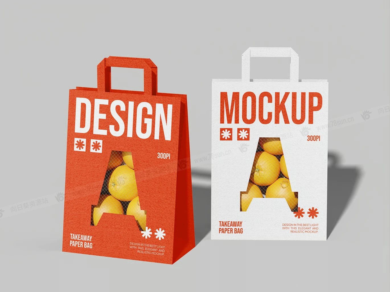 纸质手提袋购物袋品牌VI效果图展示智能贴图psd设计样机,突出纸张纹理、折叠、照明以及完全可定制的正面和侧面设计区域。