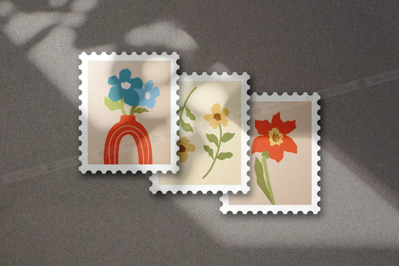 邮票品牌VI效果图展示智能贴图psd设计样机。双击智能对象图层的缩略图打开该图层,删除默认占位符图层,然后添加所需的任何图形并保存应用的更改。
