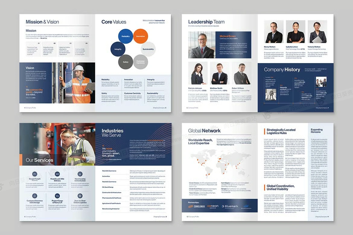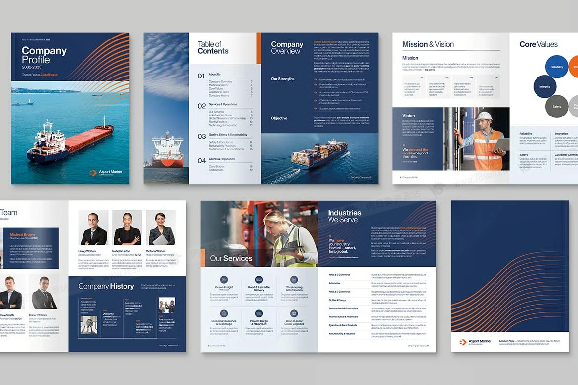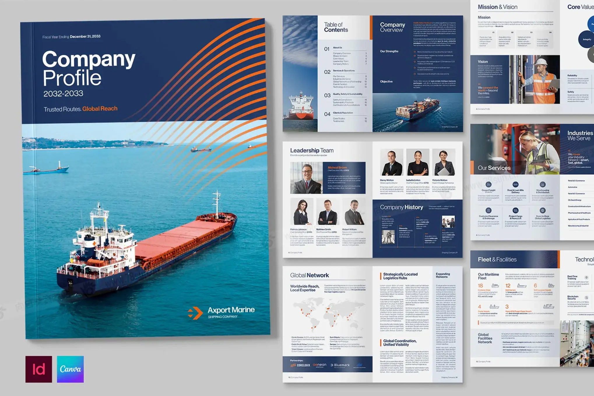 航运海事全球货运公司简介小册子杂志宣传册画册indd设计模板,提供 Canva、InDesign IDML 和 INDD 格式。此模板非常适合公司概述、商业宣传册或执行摘要,非常适合海事、航运和海洋物流行业。