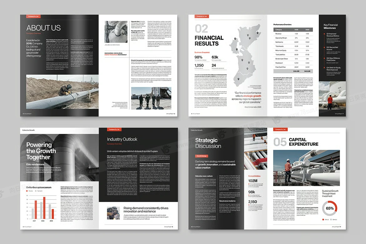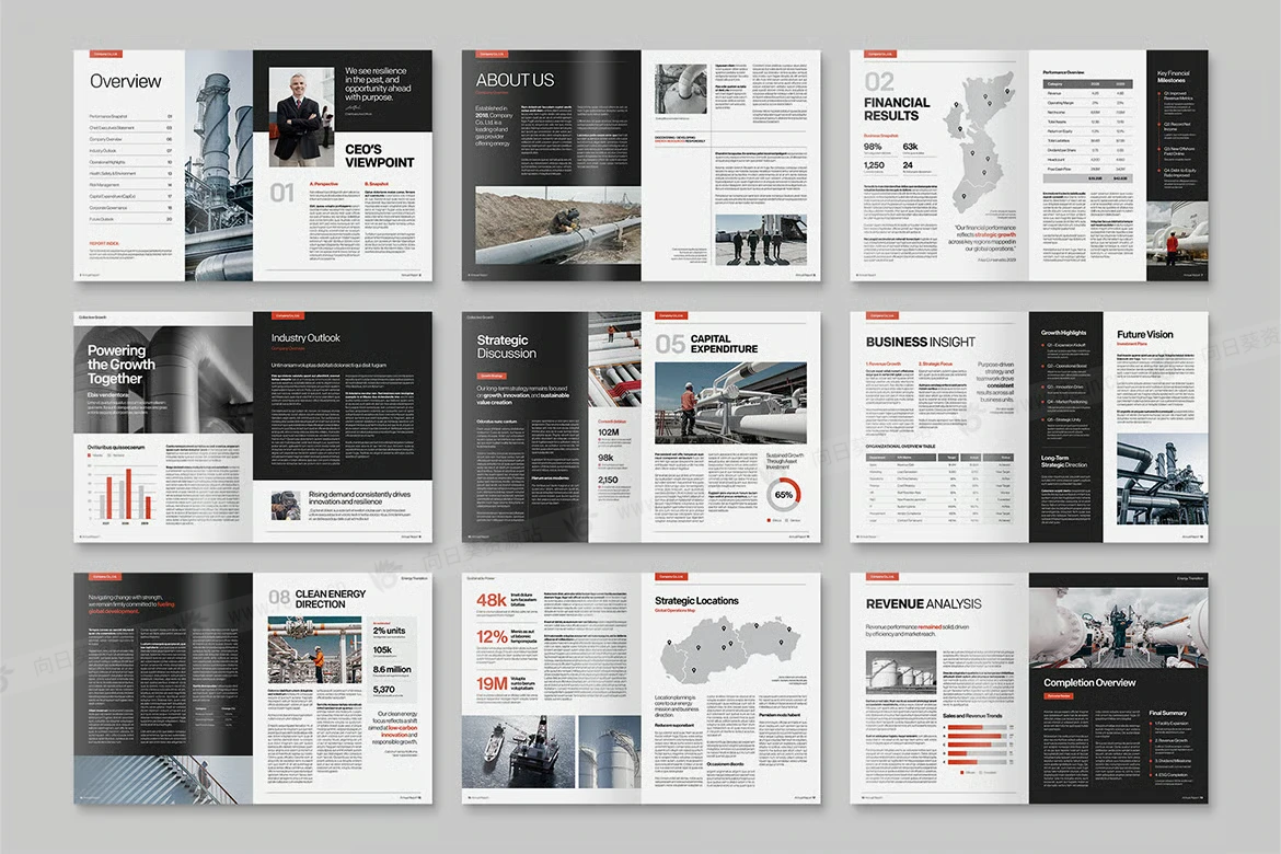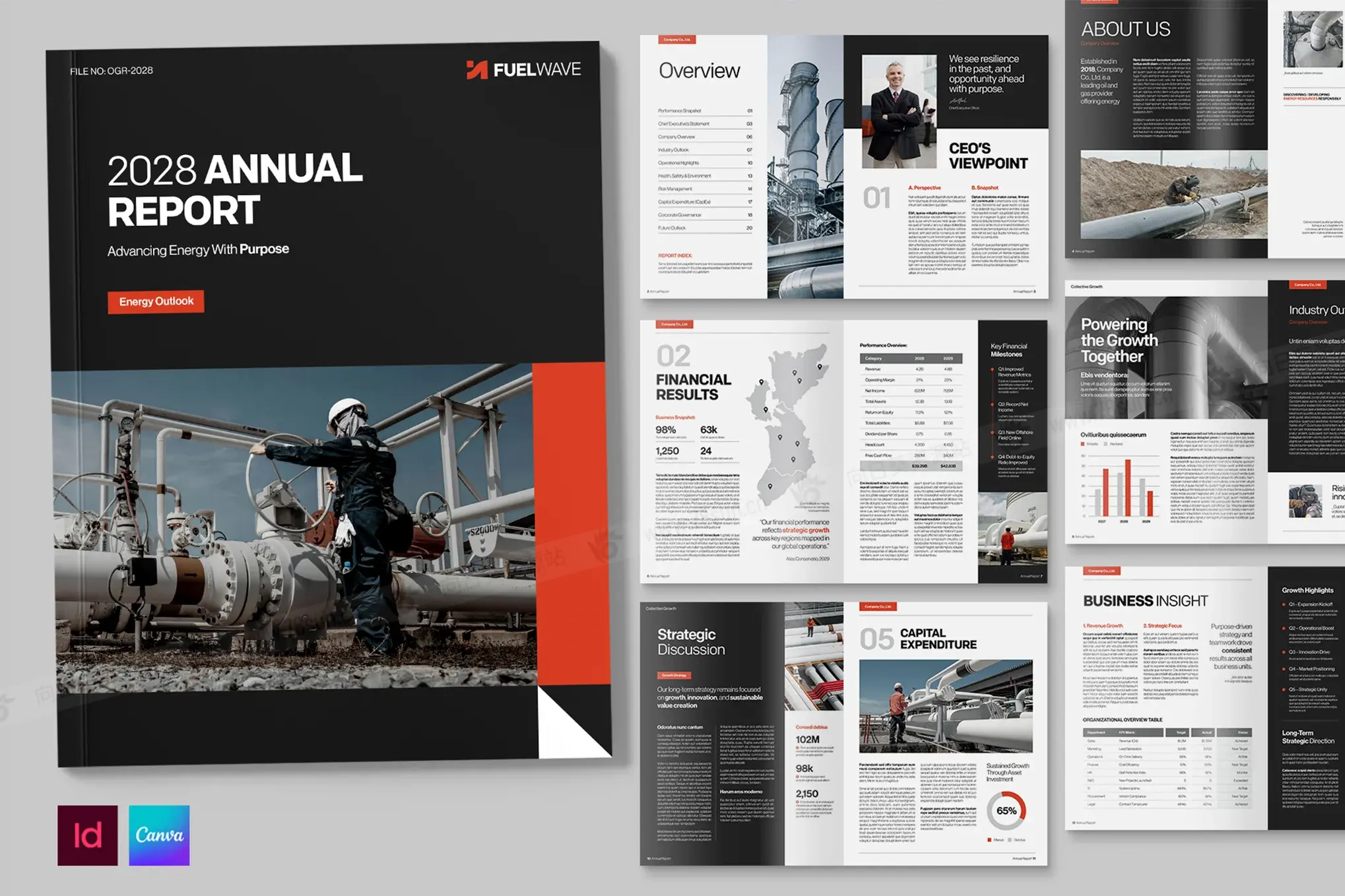 石油天然气公司简介年度报告小册子杂志宣传册画册indd设计模板,模板有 Canva 和 InDesign 格式(IDML、INDD)可供选择,完美地融合了大胆的黑色和橙色调色板,非常适合公司宣传册、公司简介和财务摘要。