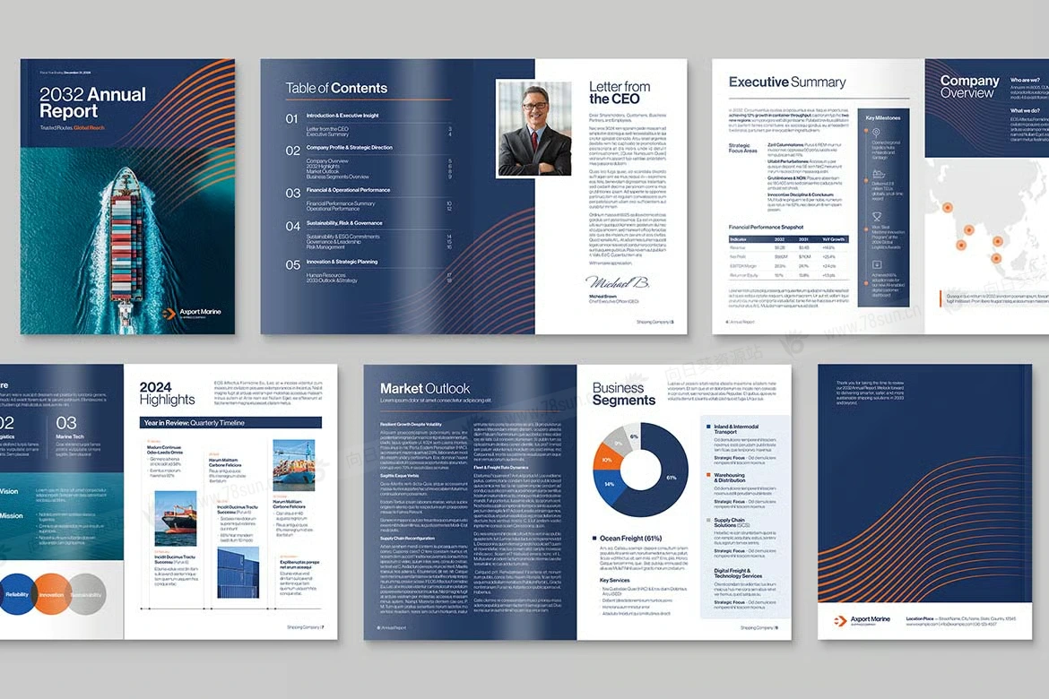 航运海事全球货运公司简介年度报告小册子杂志宣传册画册indd设计模板,展示其公司形象的海运、航运和海运物流公司而设计。此模板专为 Canva、InDesign IDML 和 INDD 格式而设计,为年度摘要、小册子和企业杂志提供了精美的演示文稿。此模板是海运和货运企业的理想选择,有助于有效地传达财务结果和战略见解。它专为物流和海洋行业的公司量身定制,非常适合提供具有专业优势的全面年度概述。