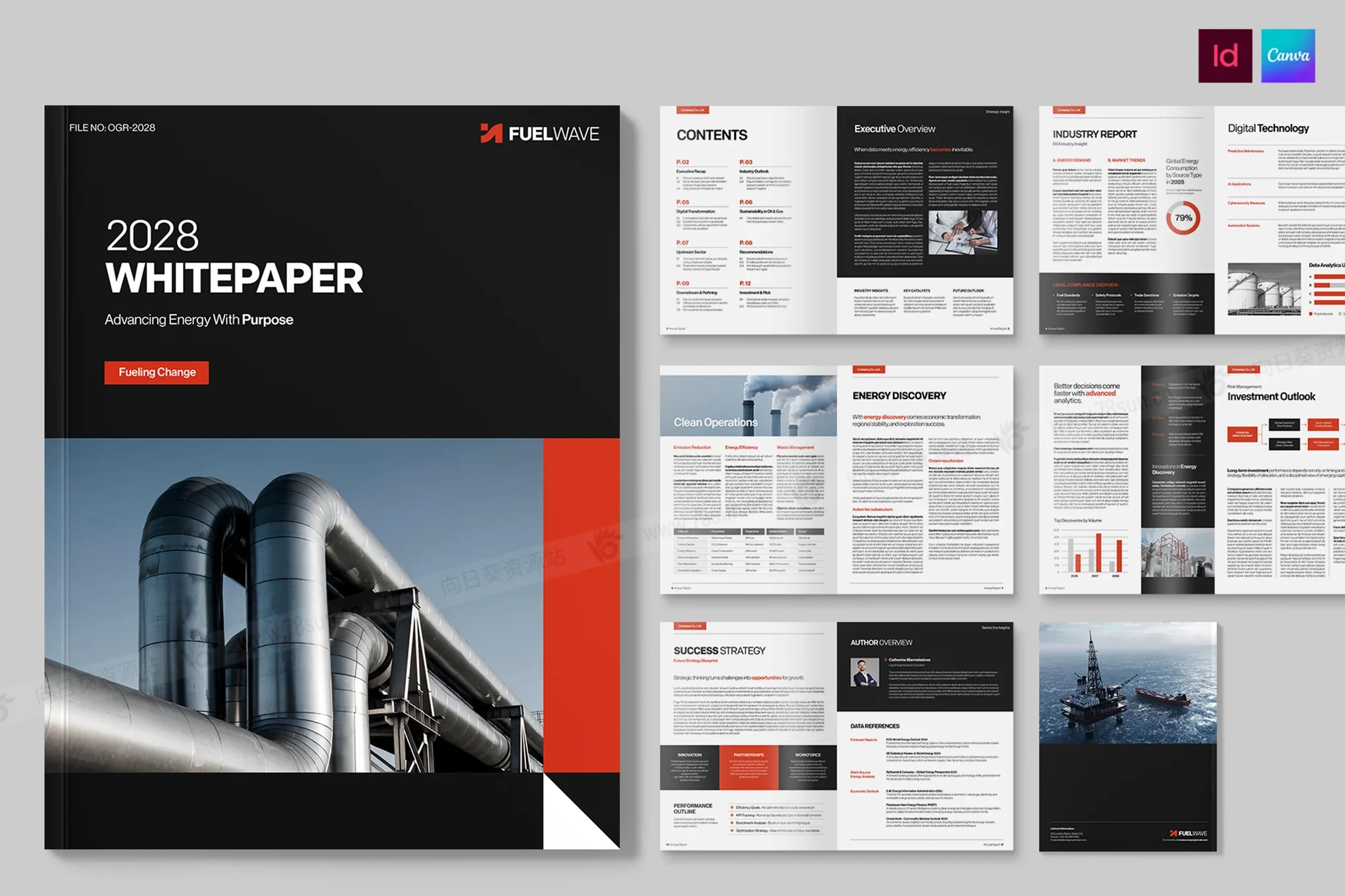 石油天然气公司简介年度报告小册子杂志宣传册画册indd设计模板。它提供 Canva、InDesign IDML 和 INDD 格式,提供简洁的布局,
