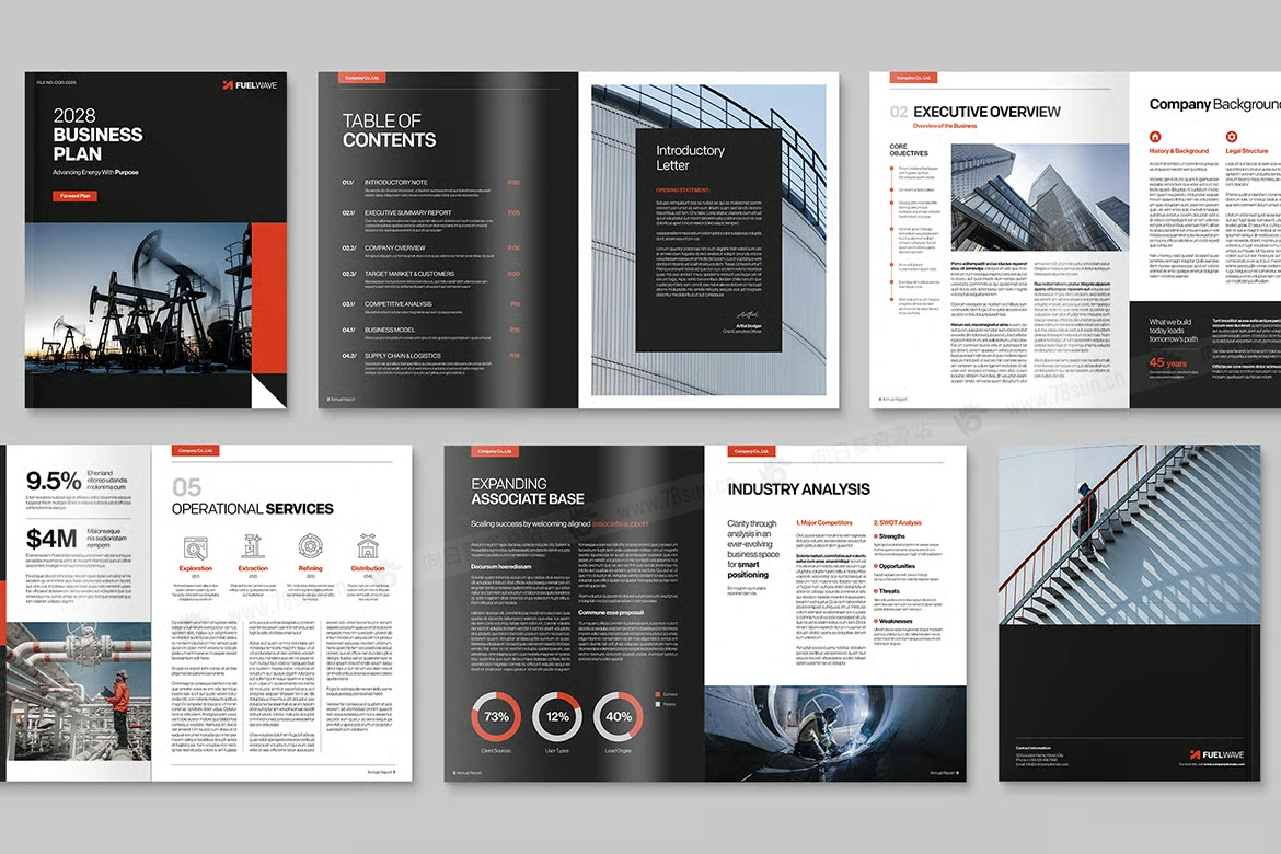 石油天然气公司简介商业计划书小册子杂志宣传册画册indd设计模板。它采用 Canva 和 InDesign IDML 和 INDD 中的可编辑格式,可满足企业客户、初创公司创始人和行业领导者的需求,旨在展示强大的项目提案。