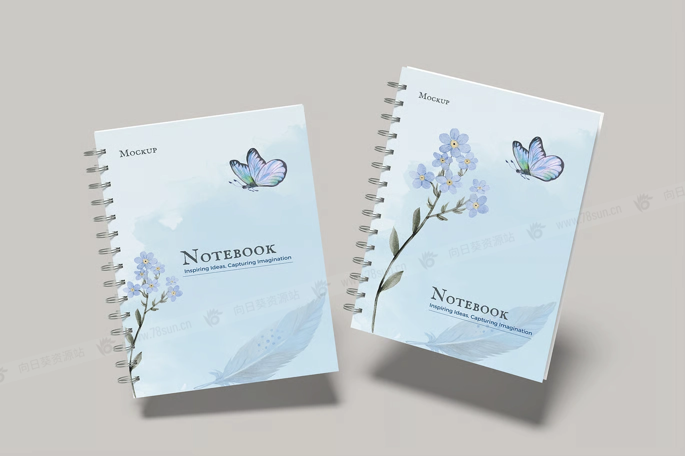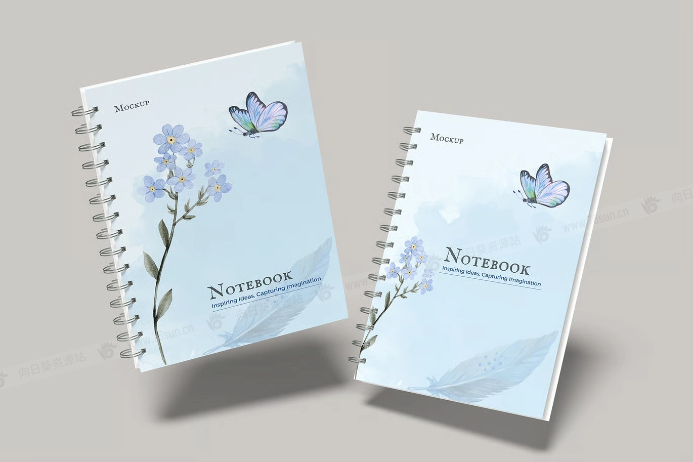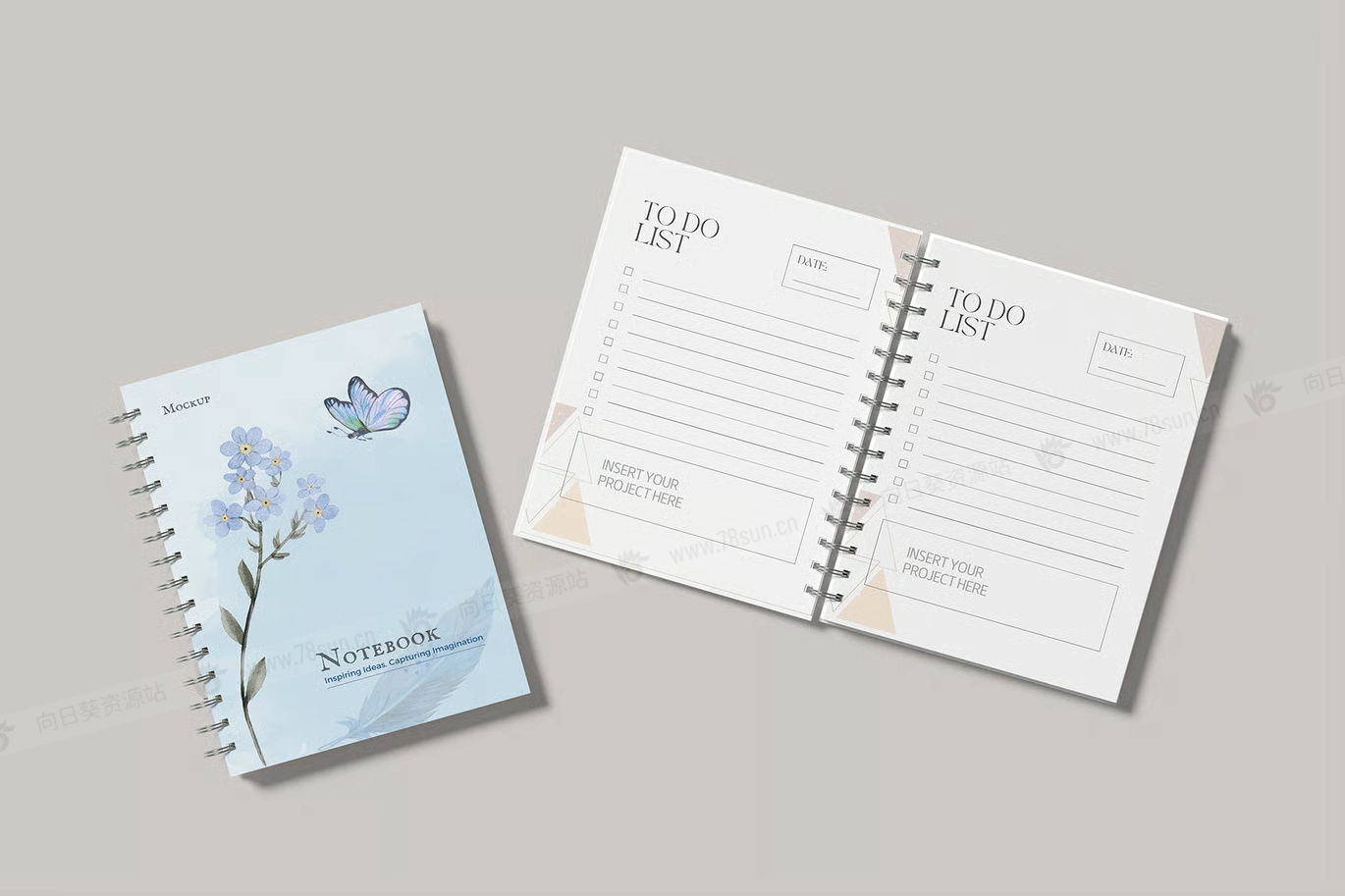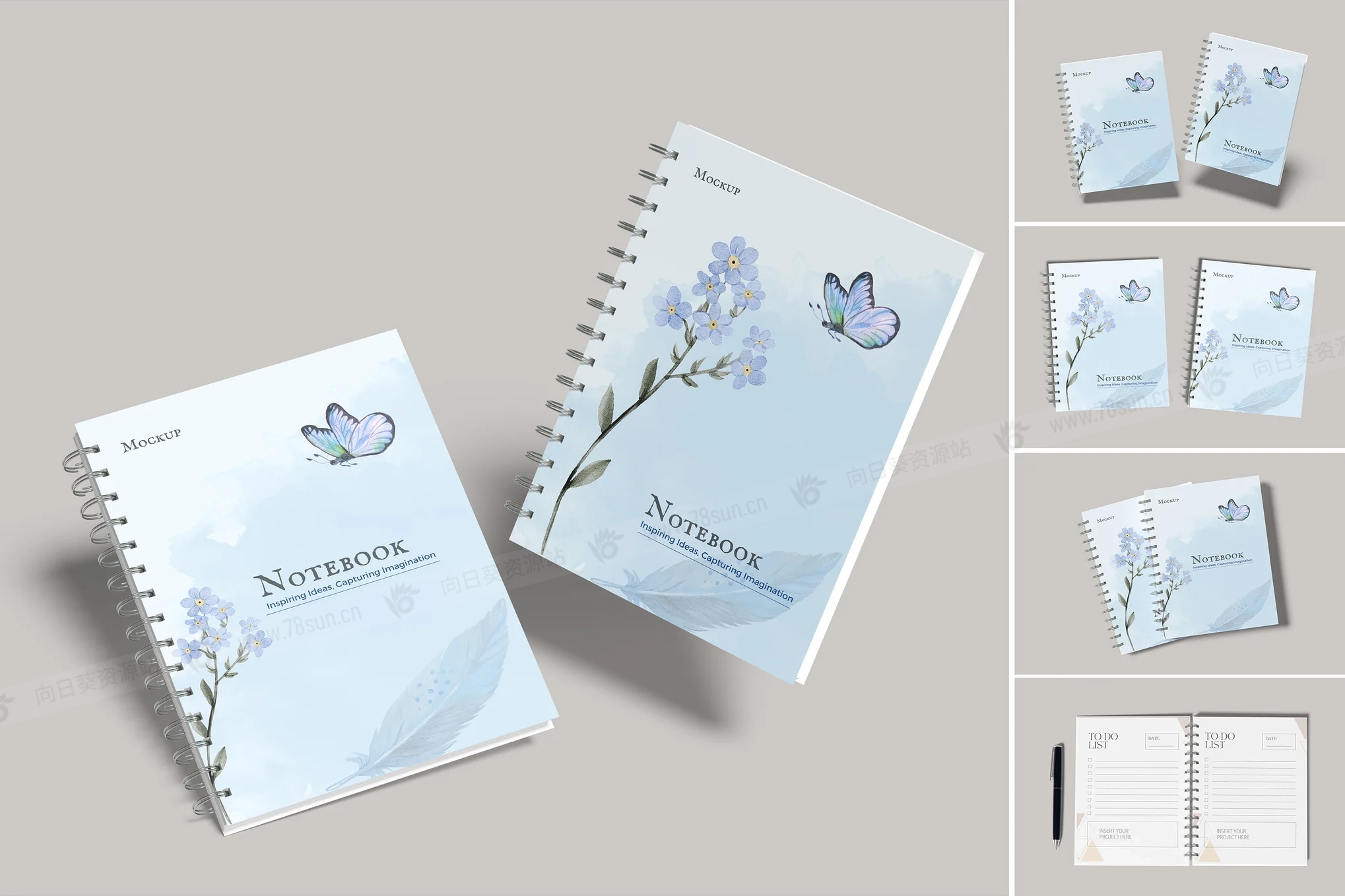 A5线圈装订螺旋日记笔记本品牌VI效果图展示智能贴图psd设计样机!在几秒钟内为您的客户创建一个逼真的 A5 螺旋笔记本模型展示。这些 PSD 文件使用智能对象功能,因此您可以轻松快速地替换模型内容。这很容易!您只需双击智能对象,粘贴您的作品,保存,即可完成。