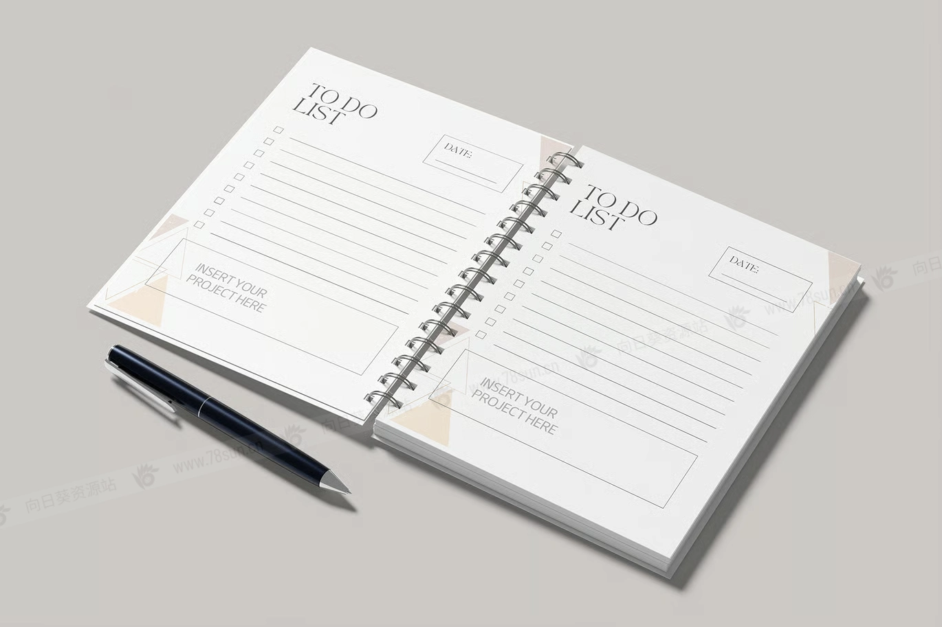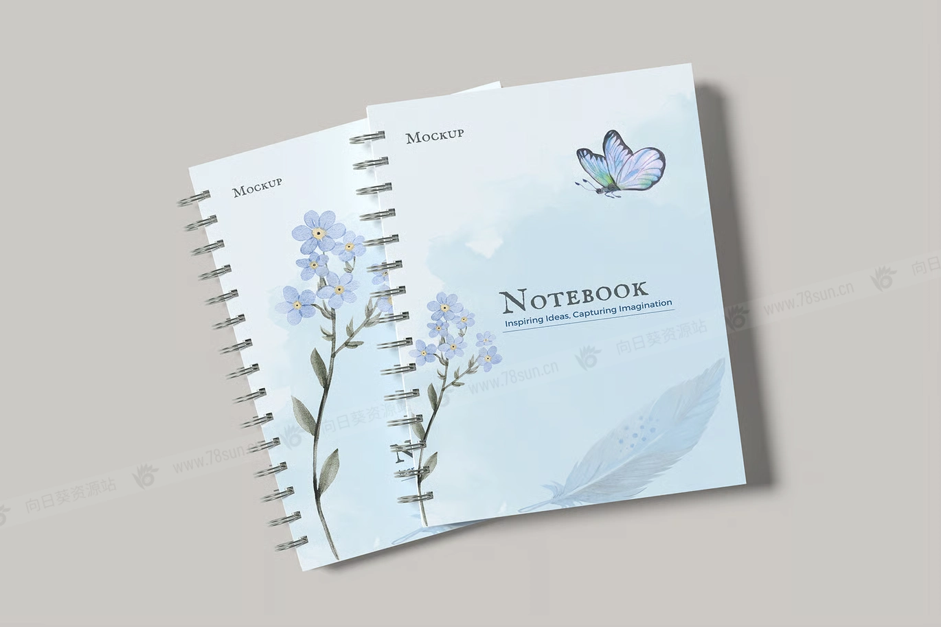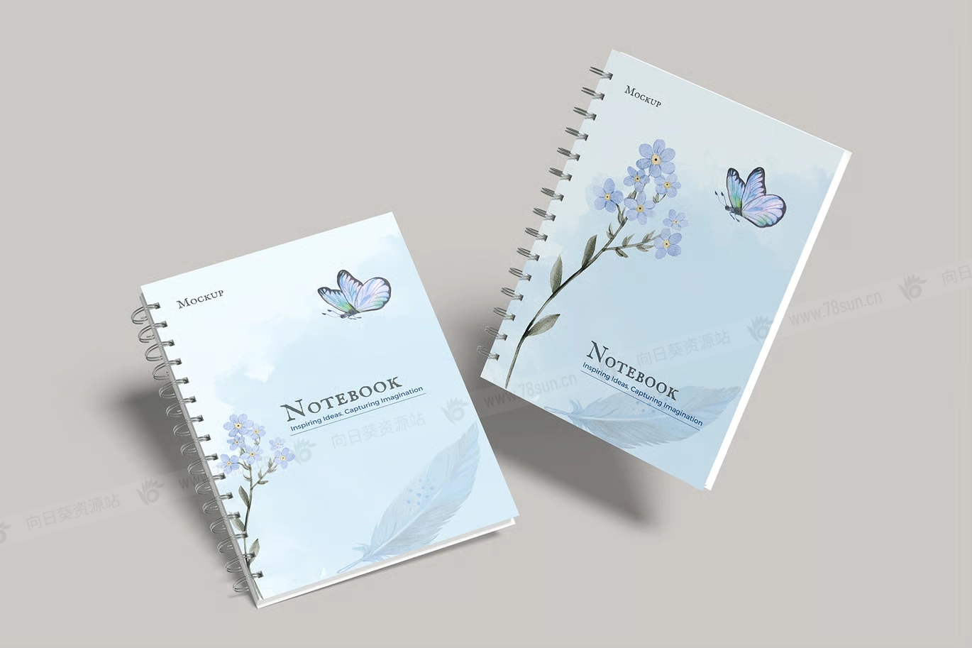 A5线圈装订螺旋日记笔记本品牌VI效果图展示智能贴图psd设计样机!在几秒钟内为您的客户创建一个逼真的 A5 螺旋笔记本模型展示。这些 PSD 文件使用智能对象功能,因此您可以轻松快速地替换模型内容。这很容易!您只需双击智能对象,粘贴您的作品,保存,即可完成。