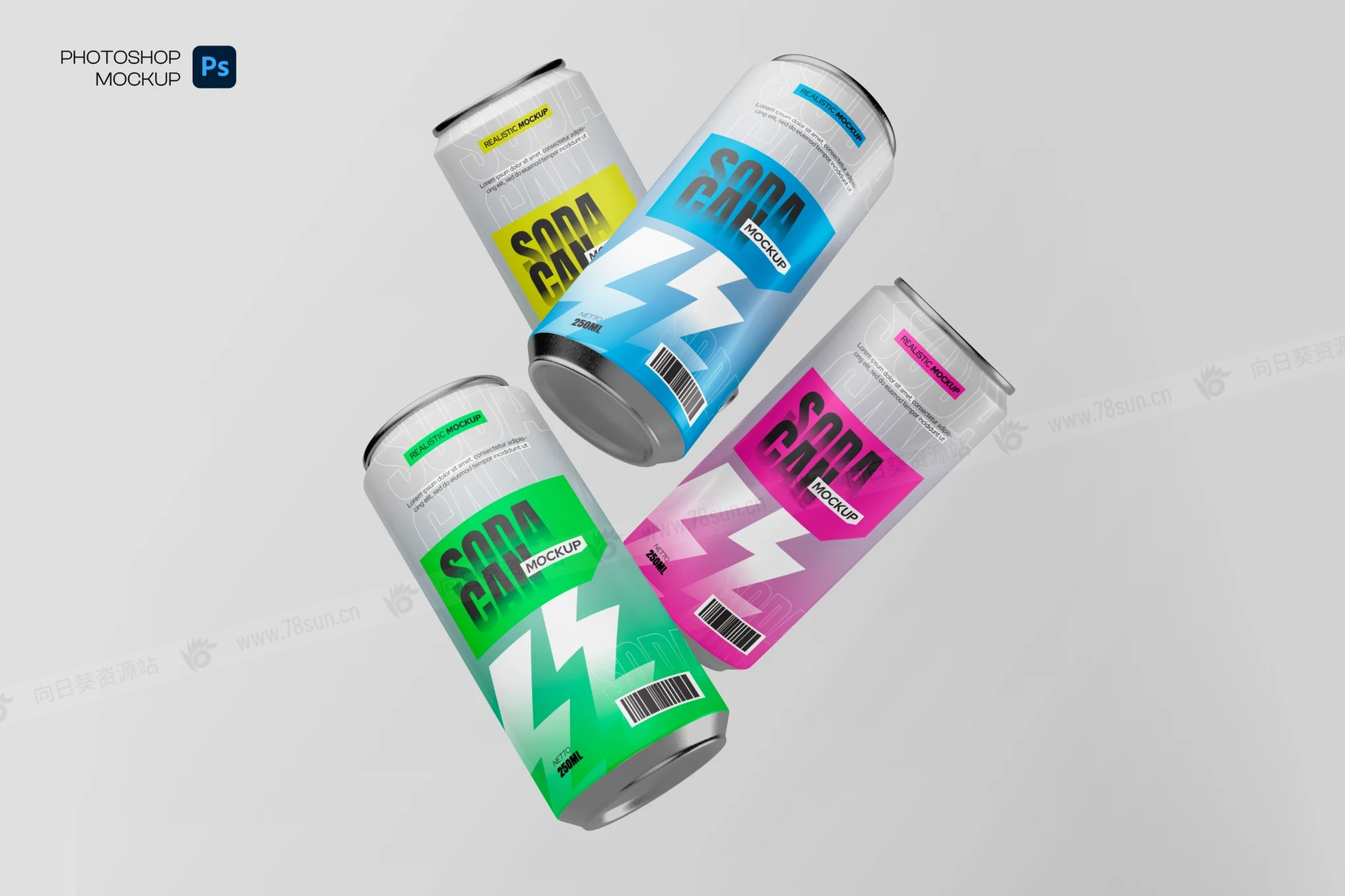 汽水饮料易拉罐头品牌VI效果图展示智能贴图psd设计样机。该文件包括用于颜色对象和背景的单独图层。标签的智能图层有助于应用您的设计并且易于使用。